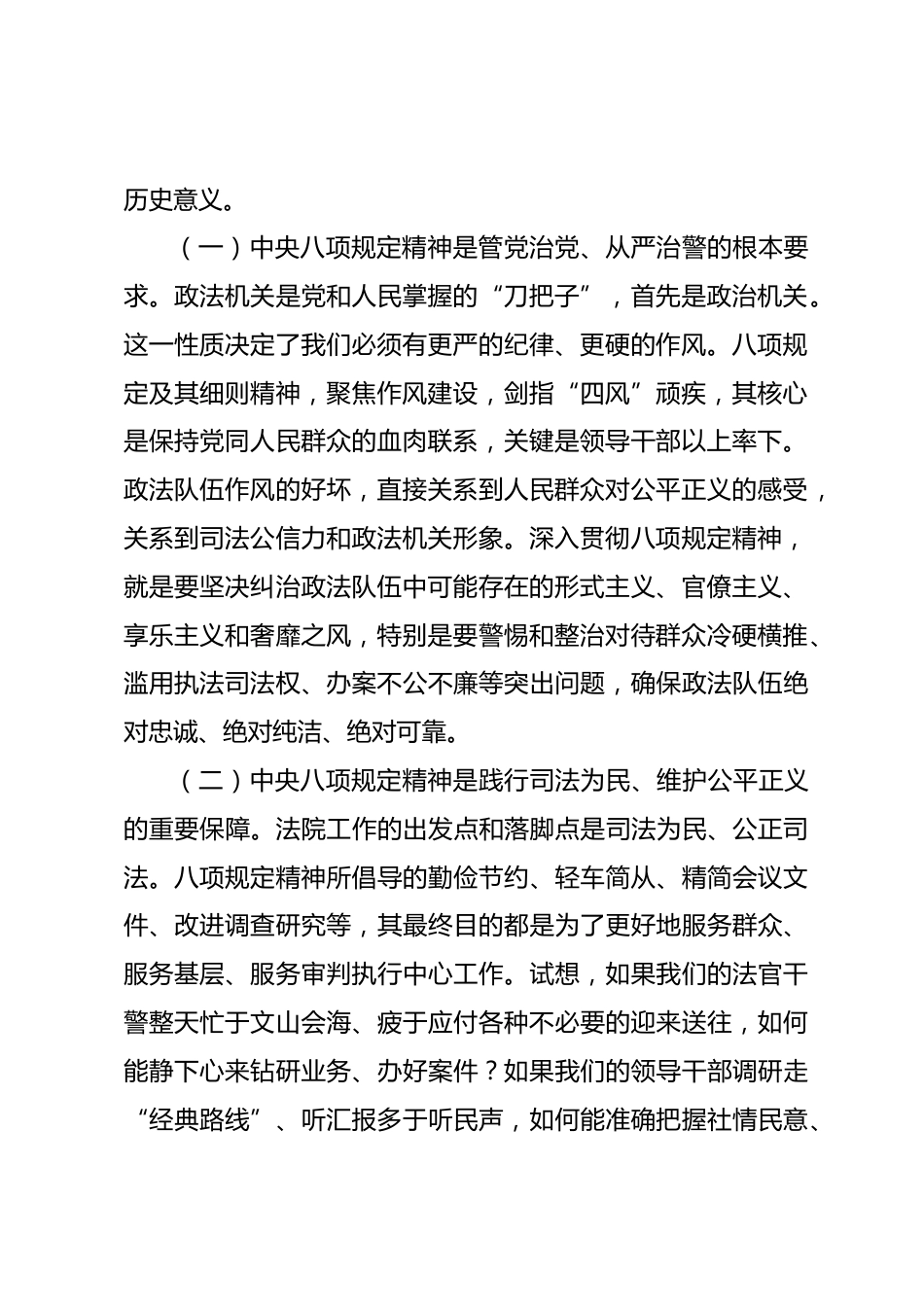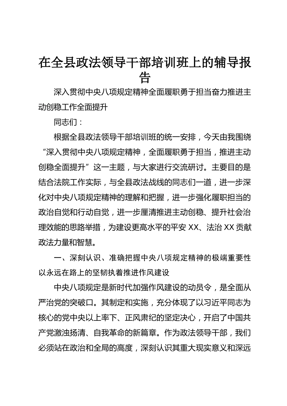 在全縣政法領(lǐng)導(dǎo)干部培訓(xùn)班上的輔導(dǎo)報(bào)告深入貫徹中央八項(xiàng)規(guī)定精神全面履職勇于擔(dān)當(dāng)奮力推進(jìn)主動(dòng)創(chuàng)穩(wěn)工作全面提升同志們:根據(jù)全縣政法領(lǐng)導(dǎo)干部培訓(xùn)班的統(tǒng)一安排,今天由我圍繞“深入貫徹中央八項(xiàng)規(guī)定精神,全面履職勇于擔(dān)當(dāng),推進(jìn)主動(dòng)創(chuàng)穩(wěn)全面提升”這一主題,與大家進(jìn)行交流研討。主要目的是結(jié)合法院工作實(shí)際,與全縣政法戰(zhàn)線的同志們一道,進(jìn)一步深化對(duì)中央八項(xiàng)規(guī)定精神的理解和把握,進(jìn)一步強(qiáng)化履職擔(dān)當(dāng)?shù)恼巫杂X(jué)和行動(dòng)自覺(jué),進(jìn)一步厘清推進(jìn)主動(dòng)創(chuàng)穩(wěn)、提升社會(huì)治理效能的思路舉措,為建設(shè)更高水平的平安XX、法治XX貢獻(xiàn)政法力量和智慧。一、深刻認(rèn)識(shí)、準(zhǔn)確把握中央八項(xiàng)...