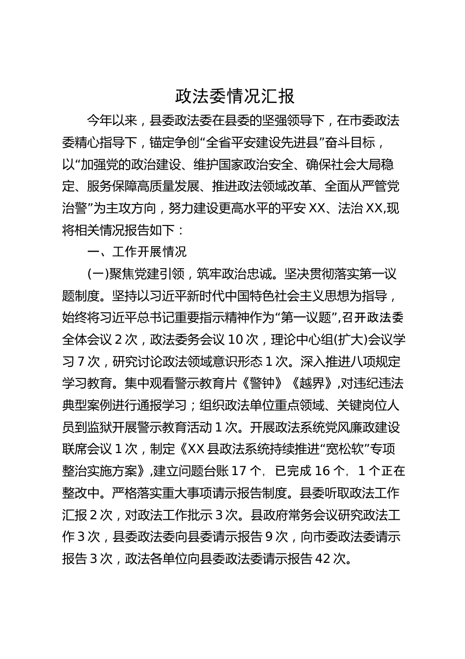 政法委情況匯報(bào)今年以來(lái),縣委政法委在縣委的堅(jiān)強(qiáng)領(lǐng)導(dǎo)下,在市委政法“”委精心指導(dǎo)下,錨定爭(zhēng)創(chuàng)全省平安建設(shè)先進(jìn)縣奮斗目標(biāo),“以加強(qiáng)黨的政治建設(shè)、維護(hù)國(guó)家政治安全、確保社會(huì)大局穩(wěn)定、服務(wù)保障高質(zhì)量發(fā)展、推進(jìn)政法領(lǐng)域改革、全面從嚴(yán)管黨”治警為主攻方向,努力建設(shè)更高水平的平安XX、法治XX,現(xiàn)將相關(guān)情況報(bào)告如下:一、工作開(kāi)展情況(一)聚焦黨建引領(lǐng),筑牢政治忠誠(chéng)。堅(jiān)決貫徹落實(shí)第一議題制度。堅(jiān)持以習(xí)近平新時(shí)代中國(guó)特色社會(huì)主義思想為指導(dǎo),“”始終將習(xí)近平總書記重要指示精神作為第一議題,召開(kāi)政法委全體會(huì)議2次,政法委務(wù)會(huì)議10次,理論中心組(擴(kuò)大)會(huì)議學(xué)...
