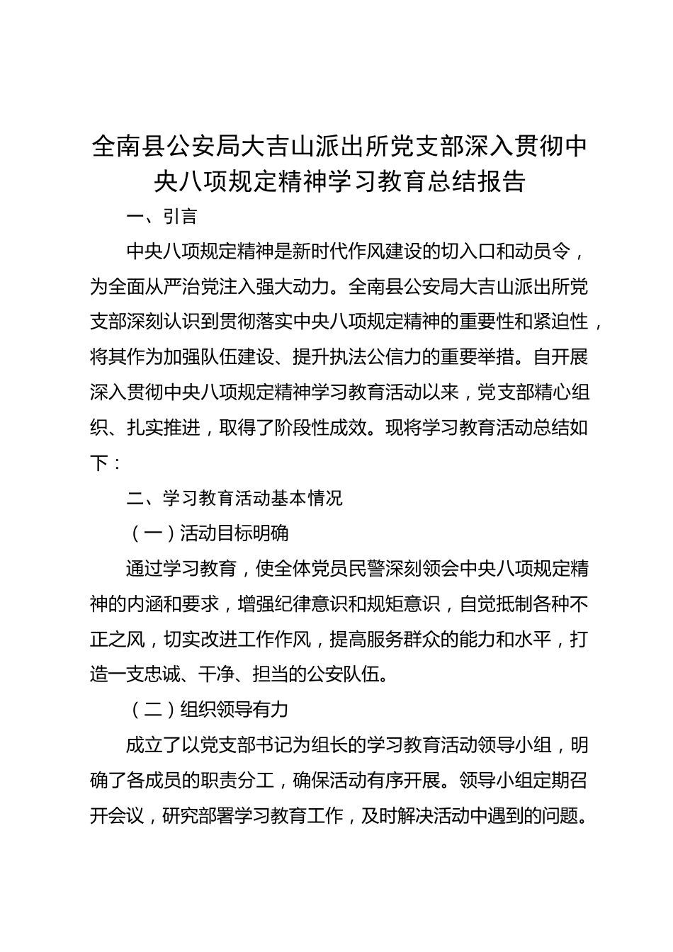 全南縣公安局大吉山派出所黨支部深入貫徹中央八項規(guī)定精神學(xué)習(xí)教育總結(jié)報告一、引言中央八項規(guī)定精神是新時代作風(fēng)建設(shè)的切入口和動員令,為全面從嚴(yán)治黨注入強(qiáng)大動力。全南縣公安局大吉山派出所黨支部深刻認(rèn)識到貫徹落實中央八項規(guī)定精神的重要性和緊迫性,將其作為加強(qiáng)隊伍建設(shè)、提升執(zhí)法公信力的重要舉措。自開展深入貫徹中央八項規(guī)定精神學(xué)習(xí)教育活動以來,黨支部精心組織、扎實推進(jìn),取得了階段性成效?,F(xiàn)將學(xué)習(xí)教育活動總結(jié)如下:二、學(xué)習(xí)教育活動基本情況(一)活動目標(biāo)明確通過學(xué)習(xí)教育,使全體黨員民警深刻領(lǐng)會中央八項規(guī)定精神的內(nèi)涵和要求,增強(qiáng)紀(jì)律意識和規(guī)矩...