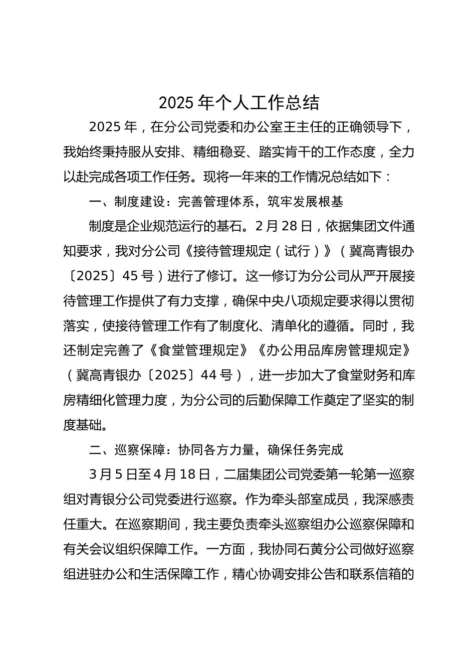 2025年個(gè)人工作總結(jié)2025年,在分公司黨委和辦公室王主任的正確領(lǐng)導(dǎo)下,我始終秉持服從安排、精細(xì)穩(wěn)妥、踏實(shí)肯干的工作態(tài)度,全力以赴完成各項(xiàng)工作任務(wù)?,F(xiàn)將一年來(lái)的工作情況總結(jié)如下:一、制度建設(shè):完善管理體系,筑牢發(fā)展根基制度是企業(yè)規(guī)范運(yùn)行的基石。2月28日,依據(jù)集團(tuán)文件通知要求,我對(duì)分公司《接待管理規(guī)定(試行)》(冀高青銀辦〔2025〕45號(hào))進(jìn)行了修訂。這一修訂為分公司從嚴(yán)開(kāi)展接待管理工作提供了有力支撐,確保中央八項(xiàng)規(guī)定要求得以貫徹落實(shí),使接待管理工作有了制度化、清單化的遵循。同時(shí),我還制定完善了《食堂管理規(guī)定》《辦公用品庫(kù)房管理規(guī)定》(...