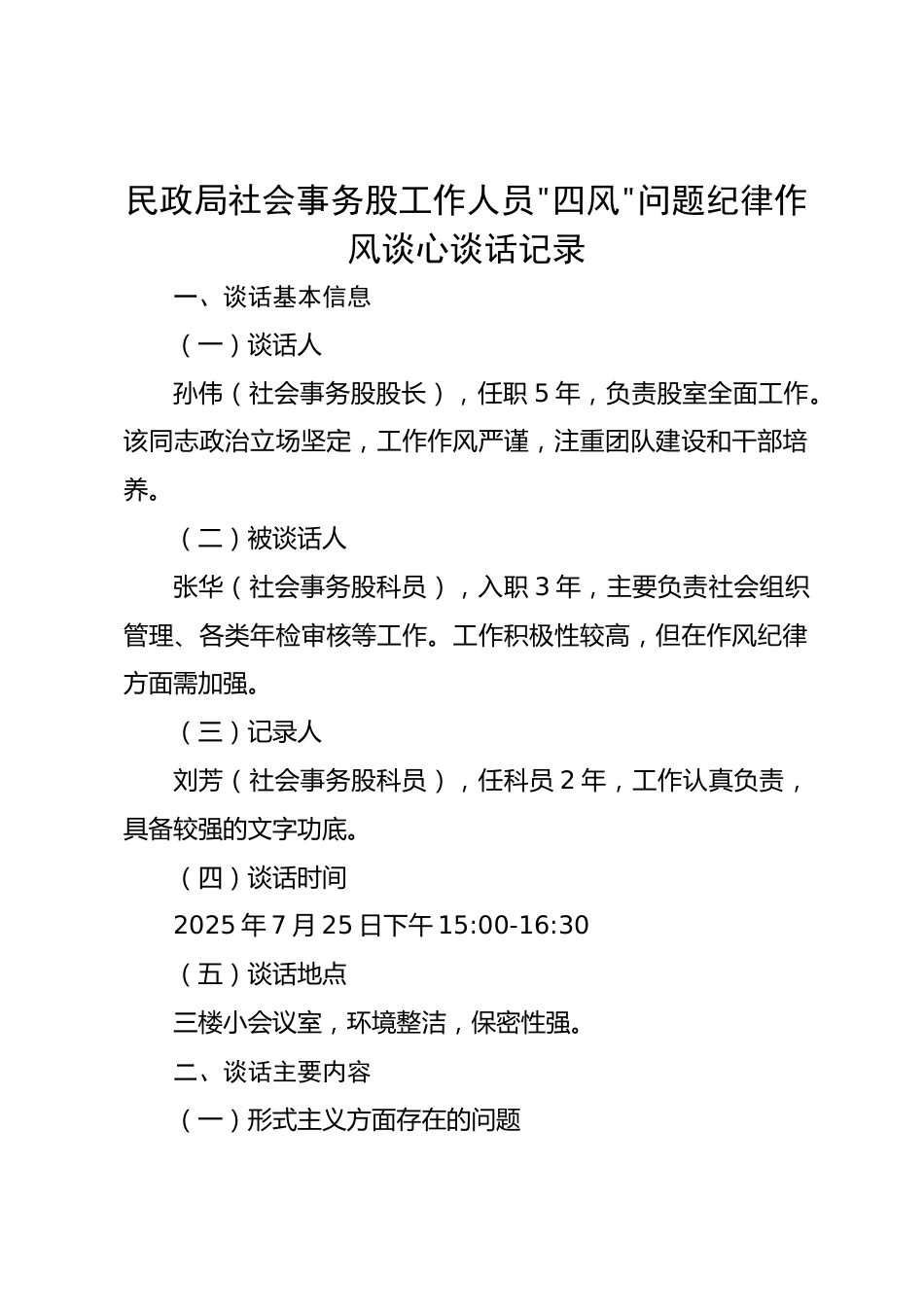 民政局社會(huì)事務(wù)股工作人員"四風(fēng)"問(wèn)題紀(jì)律作風(fēng)談心談話記錄一、談話基本信息(一)談話人孫偉(社會(huì)事務(wù)股股長(zhǎng)),任職5年,負(fù)責(zé)股室全面工作。該同志政治立場(chǎng)堅(jiān)定,工作作風(fēng)嚴(yán)謹(jǐn),注重團(tuán)隊(duì)建設(shè)和干部培養(yǎng)。(二)被談話人張華(社會(huì)事務(wù)股科員),入職3年,主要負(fù)責(zé)社會(huì)組織管理、各類年檢審核等工作。工作積極性較高,但在作風(fēng)紀(jì)律方面需加強(qiáng)。(三)記錄人劉芳(社會(huì)事務(wù)股科員),任科員2年,工作認(rèn)真負(fù)責(zé),具備較強(qiáng)的文字功底。(四)談話時(shí)間2025年7月25日下午15:00-16:30(五)談話地點(diǎn)三樓小會(huì)議室,環(huán)境整潔,保密性強(qiáng)。二、談話主要內(nèi)容(一)形式主義方面存在...