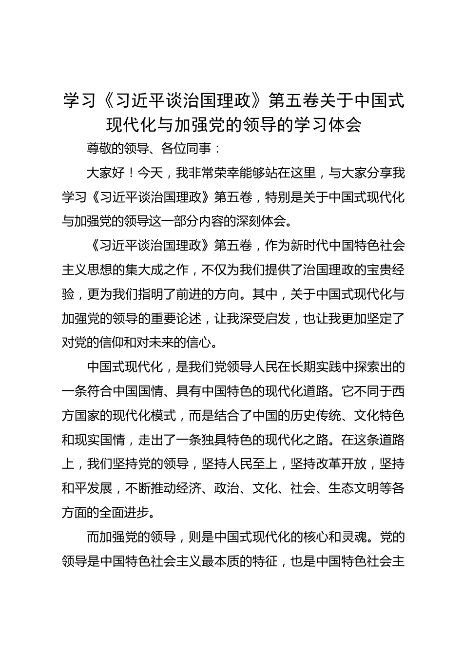 學(xué)習(xí)《習(xí)近平談治國理政》第五卷關(guān)于中國式現(xiàn)代化與加強黨的領(lǐng)導(dǎo)的學(xué)習(xí)體會尊敬的領(lǐng)導(dǎo)、各位同事:大家好!今天,我非常榮幸能夠站在這里,與大家分享我學(xué)習(xí)《習(xí)近平談治國理政》第五卷,特別是關(guān)于中國式現(xiàn)代化與加強黨的領(lǐng)導(dǎo)這一部分內(nèi)容的深刻體會。《習(xí)近平談治國理政》第五卷,作為新時代中國特色社會主義思想的集大成之作,不僅為我們提供了治國理政的寶貴經(jīng)驗,更為我們指明了前進的方向。其中,關(guān)于中國式現(xiàn)代化與加強黨的領(lǐng)導(dǎo)的重要論述,讓我深受啟發(fā),也讓我更加堅定了對黨的信仰和對未來的信心。中國式現(xiàn)代化,是我們黨領(lǐng)導(dǎo)人民在長期實踐中探索出的一條符合...