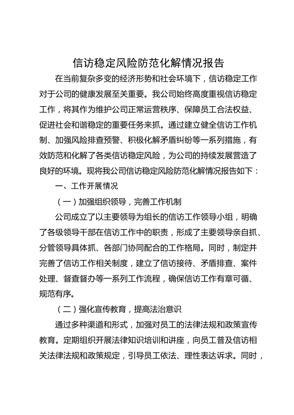 信訪穩(wěn)定風(fēng)險(xiǎn)防范化解情況報(bào)告在當(dāng)前復(fù)雜多變的經(jīng)濟(jì)形勢(shì)和社會(huì)環(huán)境下,信訪穩(wěn)定工作對(duì)于公司的健康發(fā)展至關(guān)重要。我公司始終高度重視信訪穩(wěn)定工作,將其作為維護(hù)公司正常運(yùn)營秩序、保障員工合法權(quán)益、促進(jìn)社會(huì)和諧穩(wěn)定的重要任務(wù)來抓。通過建立健全信訪工作機(jī)制、加強(qiáng)風(fēng)險(xiǎn)排查預(yù)警、積極化解矛盾糾紛等一系列措施,有效防范和化解了各類信訪穩(wěn)定風(fēng)險(xiǎn),為公司的持續(xù)發(fā)展?fàn)I造了良好的環(huán)境?,F(xiàn)將我公司信訪穩(wěn)定風(fēng)險(xiǎn)防范化解情況報(bào)告如下:一、工作開展情況(一)加強(qiáng)組織領(lǐng)導(dǎo),完善工作機(jī)制公司成立了以主要領(lǐng)導(dǎo)為組長的信訪工作領(lǐng)導(dǎo)小組,明確了各級(jí)領(lǐng)導(dǎo)干部在信訪工作中的...