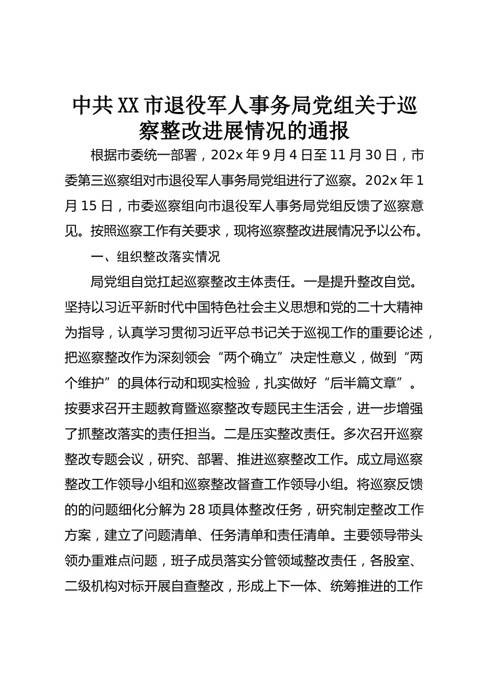 中共XX市退役軍人事務(wù)局黨組關(guān)于巡察整改進(jìn)展情況的通報(bào)
