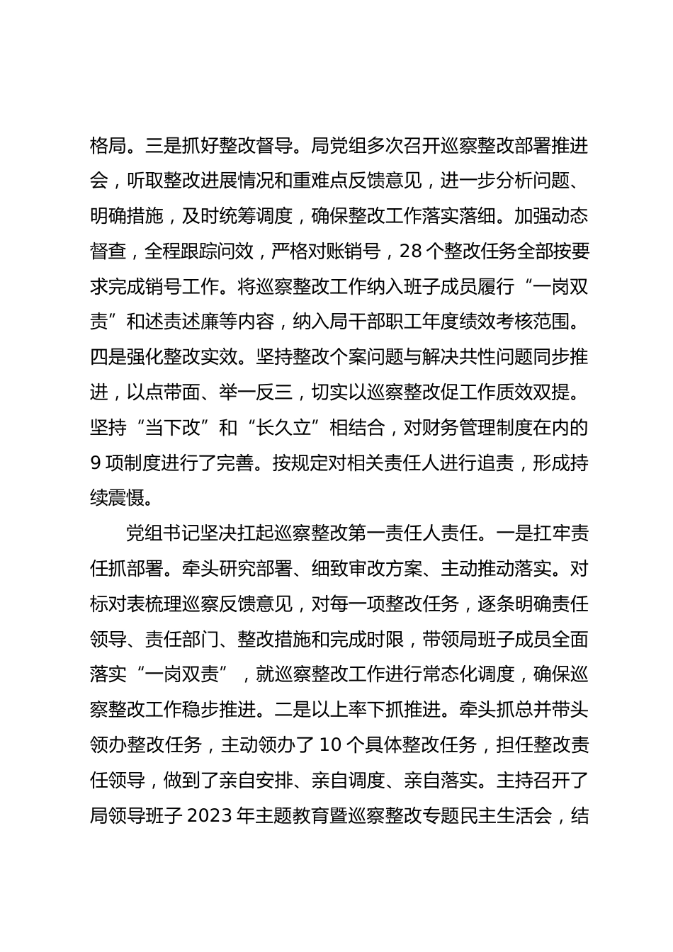 中共XX市退役軍人事務(wù)局黨組關(guān)于巡察整改進(jìn)展情況的通報(bào)根據(jù)市委統(tǒng)一部署,202x年9月4日至11月30日,市委第三巡察組對(duì)市退役軍人事務(wù)局黨組進(jìn)行了巡察。202x年1月15日,市委巡察組向市退役軍人事務(wù)局黨組反饋了巡察意見(jiàn)。按照巡察工作有關(guān)要求,現(xiàn)將巡察整改進(jìn)展情況予以公布。一、組織整改落實(shí)情況局黨組自覺(jué)扛起巡察整改主體責(zé)任。一是提升整改自覺(jué)。堅(jiān)持以習(xí)近平新時(shí)代中國(guó)特色社會(huì)主義思想和黨的二十大精神為指導(dǎo),認(rèn)真學(xué)習(xí)貫徹習(xí)近平總書(shū)記關(guān)于巡視工作的重要論述,把巡察整改作為深刻領(lǐng)會(huì)“兩個(gè)確立”決定性意義,做到“兩個(gè)維護(hù)”的具體行動(dòng)和現(xiàn)實(shí)檢驗(yàn),扎實(shí)做好...