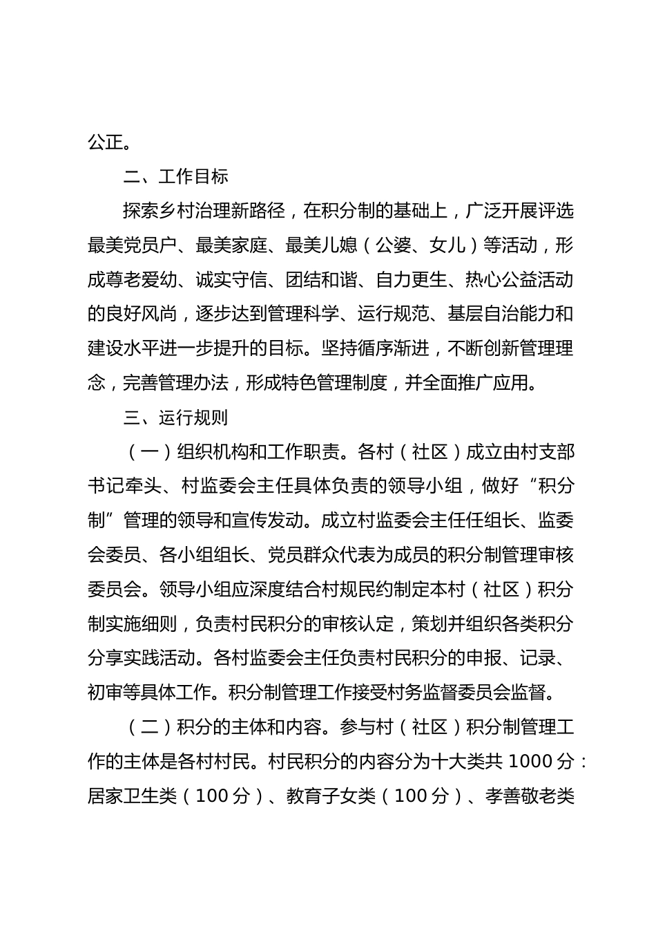 中共盛灣鎮(zhèn)委員會關(guān)于盛灣鎮(zhèn)群眾積分制管理工作實施方案為促進基層治理方式轉(zhuǎn)變,激發(fā)村民參與鄉(xiāng)村治理的積極性和創(chuàng)造性,解決群眾主體缺位、民主管理水平不高、村級組織號召力趨弱等問題,全面構(gòu)建全民共建共享的鄉(xiāng)村治理工作格局。在我鎮(zhèn)開展群眾積分制管理,按照村規(guī)民約,以村民積分為基礎(chǔ),開展“積分制”管理工作,提升民主管理水平,積分催生動力,立標(biāo)激發(fā)爭先,共建生態(tài)宜居美麗盛灣。一、總體要求(一)指導(dǎo)思想。深入貫徹落實黨的十九大、習(xí)近平總書記系列重要講話精神,強化黨建引領(lǐng)功能,深化三產(chǎn)融合,以“積分制”管理辦法,提升民主管理水平,最大限度激...