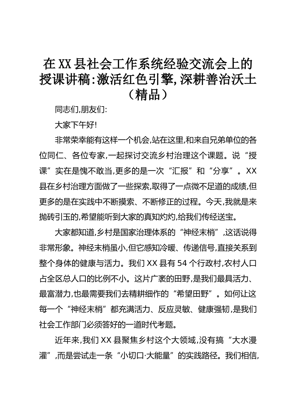 在XX縣社會(huì)工作系統(tǒng)經(jīng)驗(yàn)交流會(huì)上的授課講稿:激活紅色引擎,深耕善治沃土(精品)VIP免費(fèi)