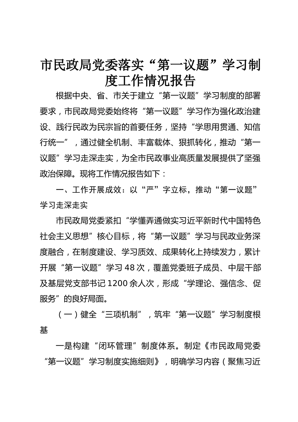 市民政局黨委落實(shí)“第一議題”學(xué)習(xí)制度工作情況報(bào)告