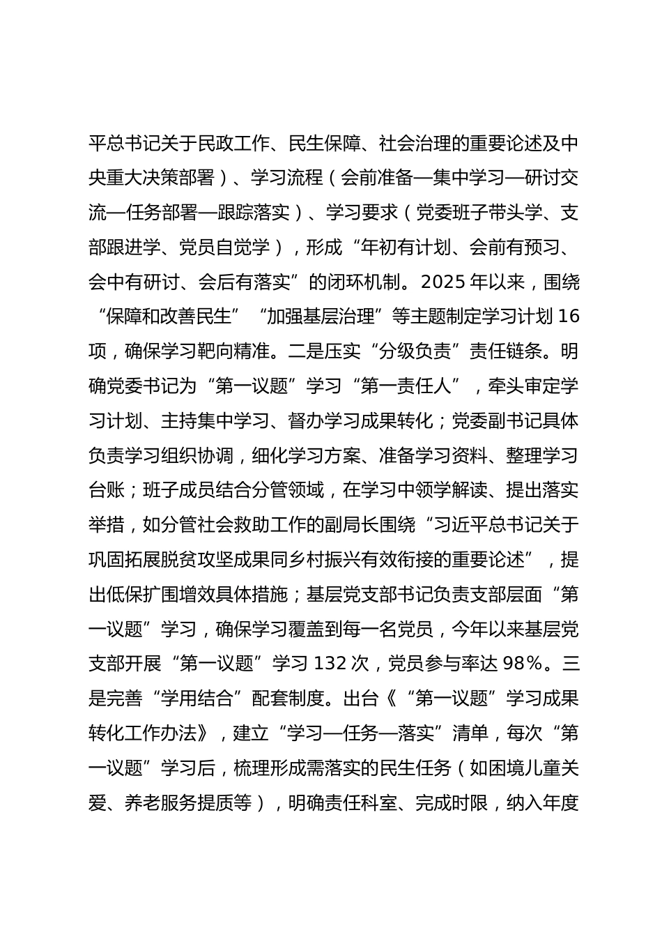 市民政局黨委落實(shí)“第一議題”學(xué)習(xí)制度工作情況報(bào)告根據(jù)中央、省、市關(guān)于建立“第一議題”學(xué)習(xí)制度的部署要求,市民政局黨委始終將“第一議題”學(xué)習(xí)作為強(qiáng)化政治建設(shè)、踐行民政為民宗旨的首要任務(wù),堅(jiān)持“學(xué)思用貫通、知信行統(tǒng)一”,通過健全機(jī)制、豐富載體、狠抓轉(zhuǎn)化,推動(dòng)“第一議題”學(xué)習(xí)走深走實(shí),為全市民政事業(yè)高質(zhì)量發(fā)展提供了堅(jiān)強(qiáng)政治保障。現(xiàn)將工作情況報(bào)告如下:一、工作開展成效:以“嚴(yán)”字立標(biāo),推動(dòng)“第一議題”學(xué)習(xí)走深走實(shí)市民政局黨委緊扣“學(xué)懂弄通做實(shí)習(xí)近平新時(shí)代中國(guó)特色社會(huì)主義思想”核心目標(biāo),將“第一議題”學(xué)習(xí)與民政業(yè)務(wù)深度融合,在制度建設(shè)...