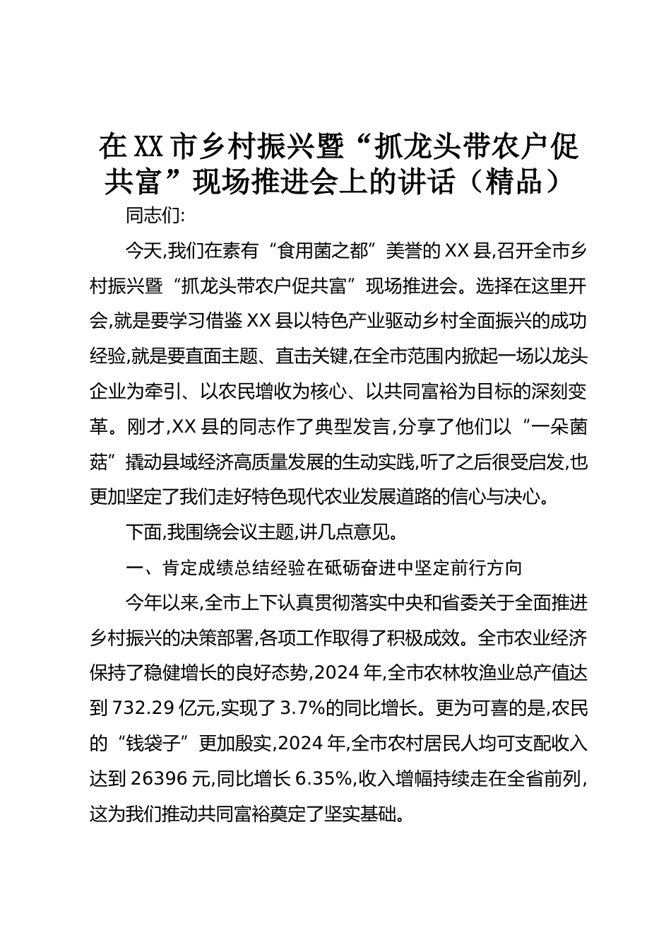 在XX市鄉(xiāng)村振興暨“抓龍頭帶農(nóng)戶促共富”現(xiàn)場推進會上的講話(精品)VIP免費