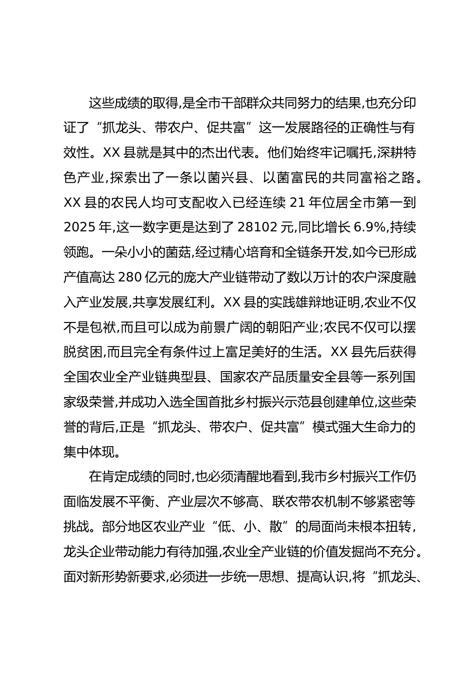 在XX市鄉(xiāng)村振興暨“抓龍頭帶農(nóng)戶促共富”現(xiàn)場推進會上的講話(精品)同志們:今天,我們在素有“食用菌之都”美譽的XX縣,召開全市鄉(xiāng)村振興暨“抓龍頭帶農(nóng)戶促共富”現(xiàn)場推進會。選擇在這里開會,就是要學習借鑒XX縣以特色產(chǎn)業(yè)驅(qū)動鄉(xiāng)村全面振興的成功經(jīng)驗,就是要直面主題、直擊關(guān)鍵,在全市范圍內(nèi)掀起一場以龍頭企業(yè)為牽引、以農(nóng)民增收為核心、以共同富裕為目標的深刻變革。剛才,XX縣的同志作了典型發(fā)言,分享了他們以“一朵菌菇”撬動縣域經(jīng)濟高質(zhì)量發(fā)展的生動實踐,聽了之后很受啟發(fā),也更加堅定了我們走好特色現(xiàn)代農(nóng)業(yè)發(fā)展道路的信心與決心。下面,我圍繞會議主題,講幾點意見。...