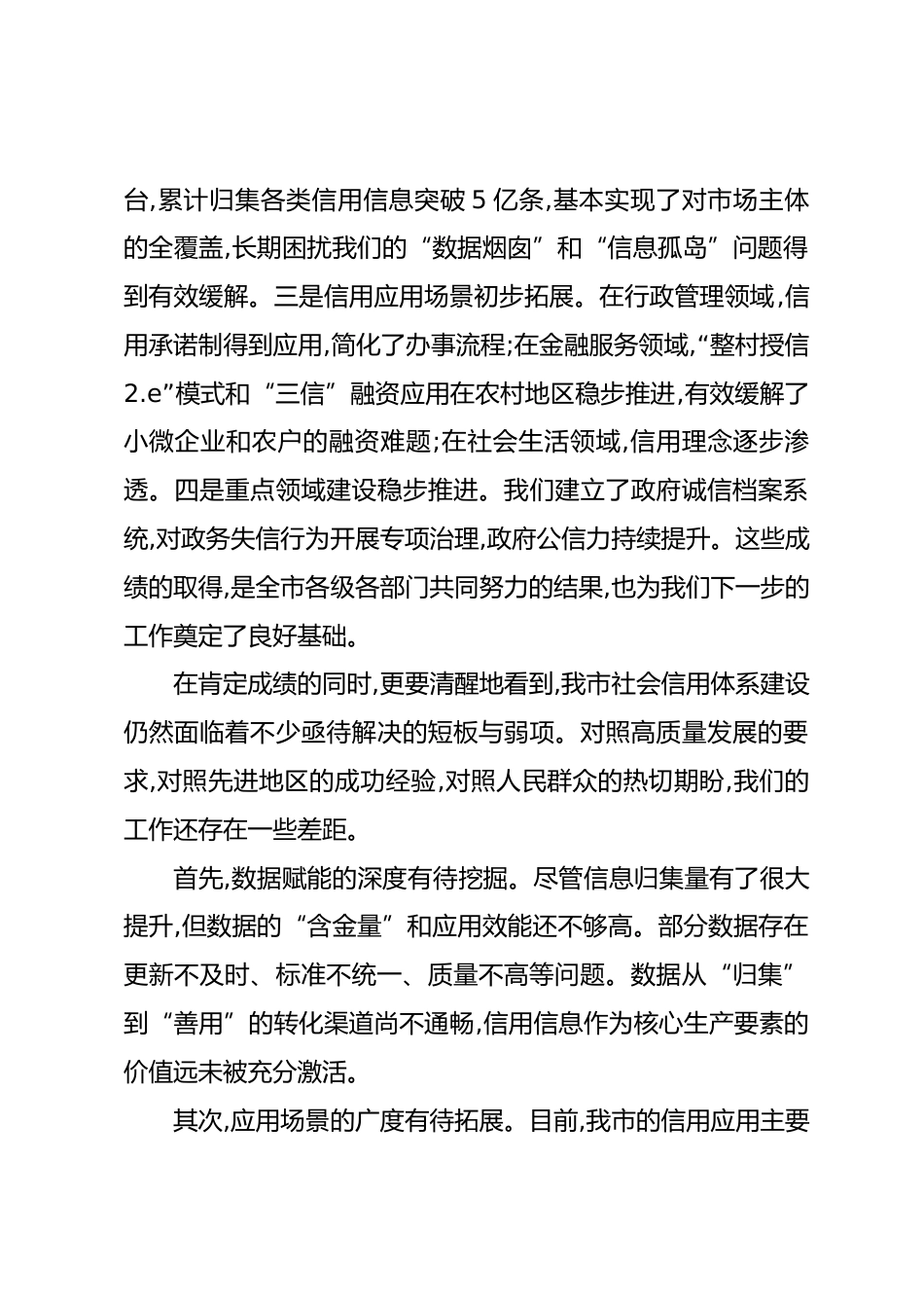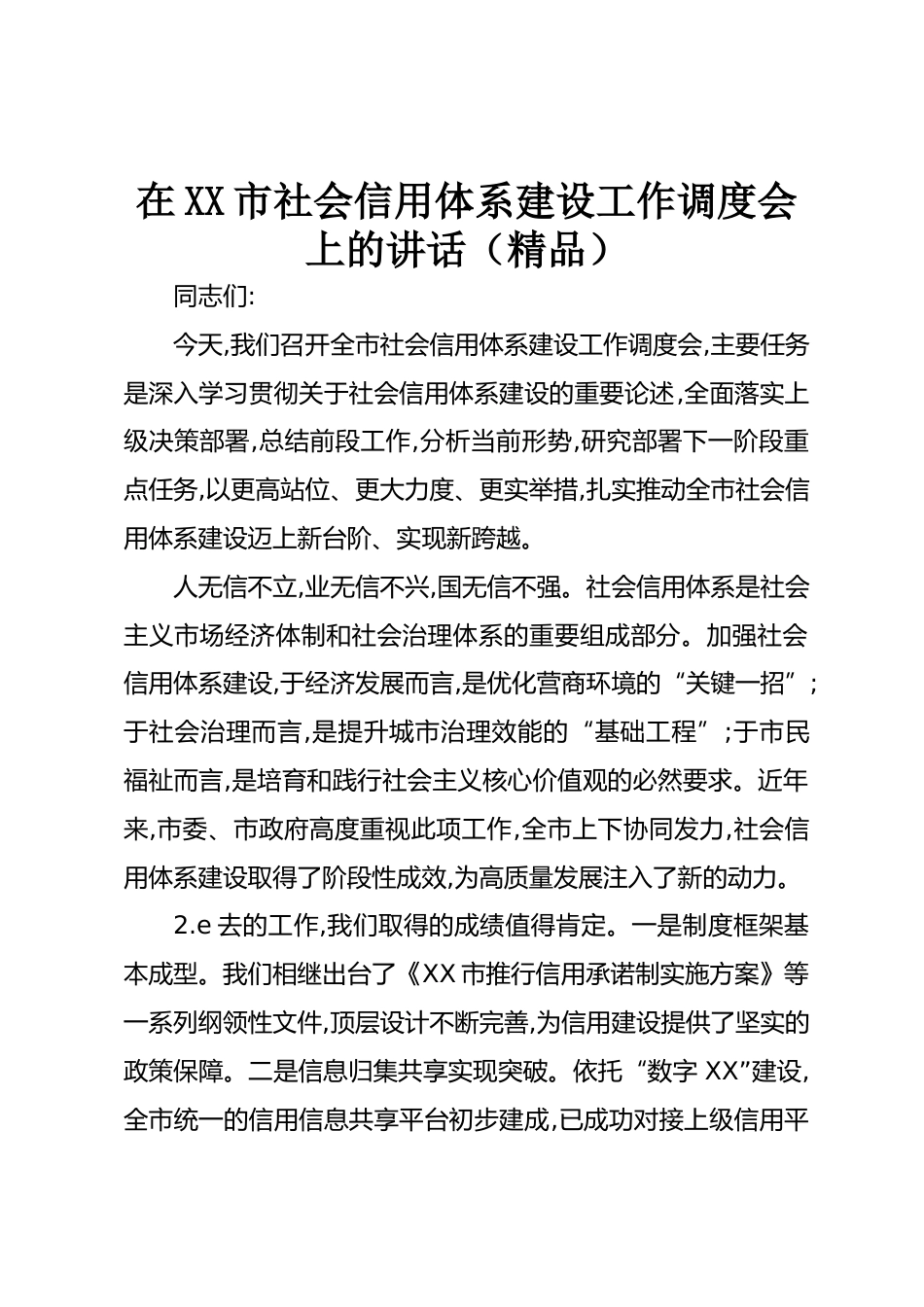 在XX市社會(huì)信用體系建設(shè)工作調(diào)度會(huì)上的講話(精品)同志們:今天,我們召開全市社會(huì)信用體系建設(shè)工作調(diào)度會(huì),主要任務(wù)是深入學(xué)習(xí)貫徹關(guān)于社會(huì)信用體系建設(shè)的重要論述,全面落實(shí)上級(jí)決策部署,總結(jié)前段工作,分析當(dāng)前形勢(shì),研究部署下一階段重點(diǎn)任務(wù),以更高站位、更大力度、更實(shí)舉措,扎實(shí)推動(dòng)全市社會(huì)信用體系建設(shè)邁上新臺(tái)階、實(shí)現(xiàn)新跨越。人無(wú)信不立,業(yè)無(wú)信不興,國(guó)無(wú)信不強(qiáng)。社會(huì)信用體系是社會(huì)主義市場(chǎng)經(jīng)濟(jì)體制和社會(huì)治理體系的重要組成部分。加強(qiáng)社會(huì)信用體系建設(shè),于經(jīng)濟(jì)發(fā)展而言,是優(yōu)化營(yíng)商環(huán)境的“關(guān)鍵一招”;于社會(huì)治理而言,是提升城市治理效能的“基礎(chǔ)工程”;于市民福祉而...