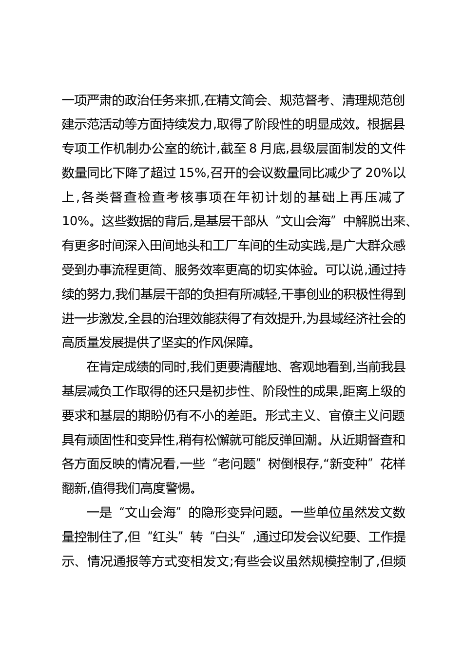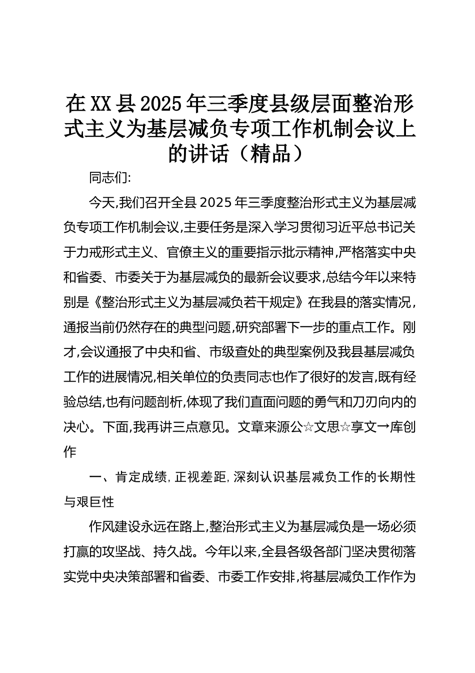 在XX縣2025年三季度縣級(jí)層面整治形式主義為基層減負(fù)專項(xiàng)工作機(jī)制會(huì)議上的講話(精品)