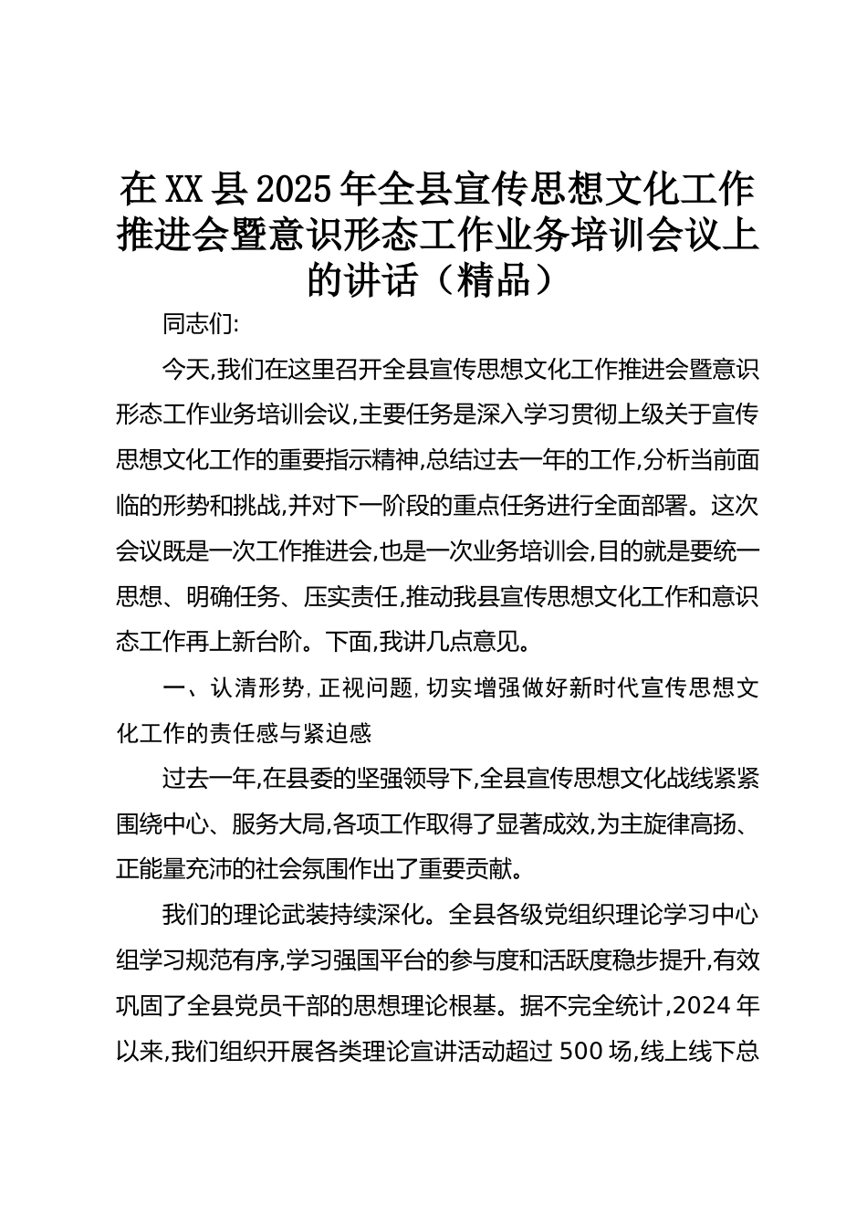 在XX縣2025年全縣宣傳思想文化工作推進(jìn)會(huì)暨意識(shí)形態(tài)工作業(yè)務(wù)培訓(xùn)會(huì)議上的講話(精品)