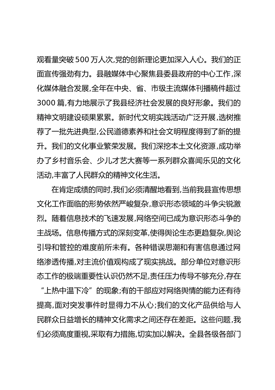 在XX縣2025年全縣宣傳思想文化工作推進(jìn)會(huì)暨意識(shí)形態(tài)工作業(yè)務(wù)培訓(xùn)會(huì)議上的講話(精品)同志們:今天,我們?cè)谶@里召開全縣宣傳思想文化工作推進(jìn)會(huì)暨意識(shí)形態(tài)工作業(yè)務(wù)培訓(xùn)會(huì)議,主要任務(wù)是深入學(xué)習(xí)貫徹上級(jí)關(guān)于宣傳思想文化工作的重要指示精神,總結(jié)過去一年的工作,分析當(dāng)前面臨的形勢(shì)和挑戰(zhàn),并對(duì)下一階段的重點(diǎn)任務(wù)進(jìn)行全面部署。這次會(huì)議既是一次工作推進(jìn)會(huì),也是一次業(yè)務(wù)培訓(xùn)會(huì),目的就是要統(tǒng)一思想、明確任務(wù)、壓實(shí)責(zé)任,推動(dòng)我縣宣傳思想文化工作和意識(shí)態(tài)工作再上新臺(tái)階。下面,我講幾點(diǎn)意見。一、認(rèn)清形勢(shì),正視問題,切實(shí)增強(qiáng)做好新時(shí)代宣傳思想文化工作的責(zé)任感與緊迫感過去一...