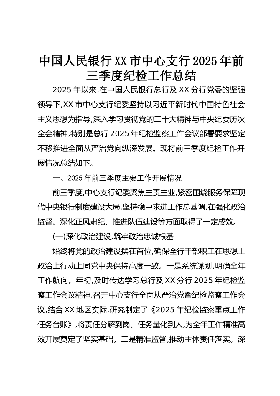 中國人民銀行XX市中心支行2025年前三季度紀(jì)檢工作總結(jié)
