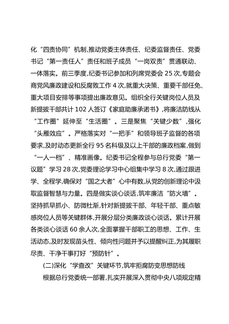 中國人民銀行XX市中心支行2025年前三季度紀(jì)檢工作總結(jié)2025年以來,在中國人民銀行總行及XX分行黨委的堅強領(lǐng)導(dǎo)下,XX市中心支行紀(jì)委堅持以習(xí)近平新時代中國特色社會主義思想為指導(dǎo),深入學(xué)習(xí)貫徹黨的二十大精神與中央紀(jì)委歷次全會精神,特別是總行2025年紀(jì)檢監(jiān)察工作會議部署要求堅定不移推進全面從嚴(yán)治黨向縱深發(fā)展?,F(xiàn)將前三季度紀(jì)檢工作開展情況總結(jié)如下。一、2025年前三季度主要工作開展情況前三季度,中心支行紀(jì)委聚焦主責(zé)主業(yè),緊密圍繞服務(wù)保障現(xiàn)代中央銀行制度建設(shè)大局,堅持穩(wěn)中求進工作總基調(diào),在強化政治監(jiān)督、深化正風(fēng)肅紀(jì)、推進隊伍建設(shè)等方面取得了一定成效。(一)深...