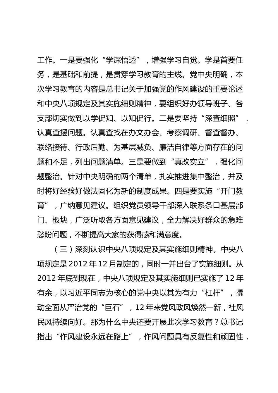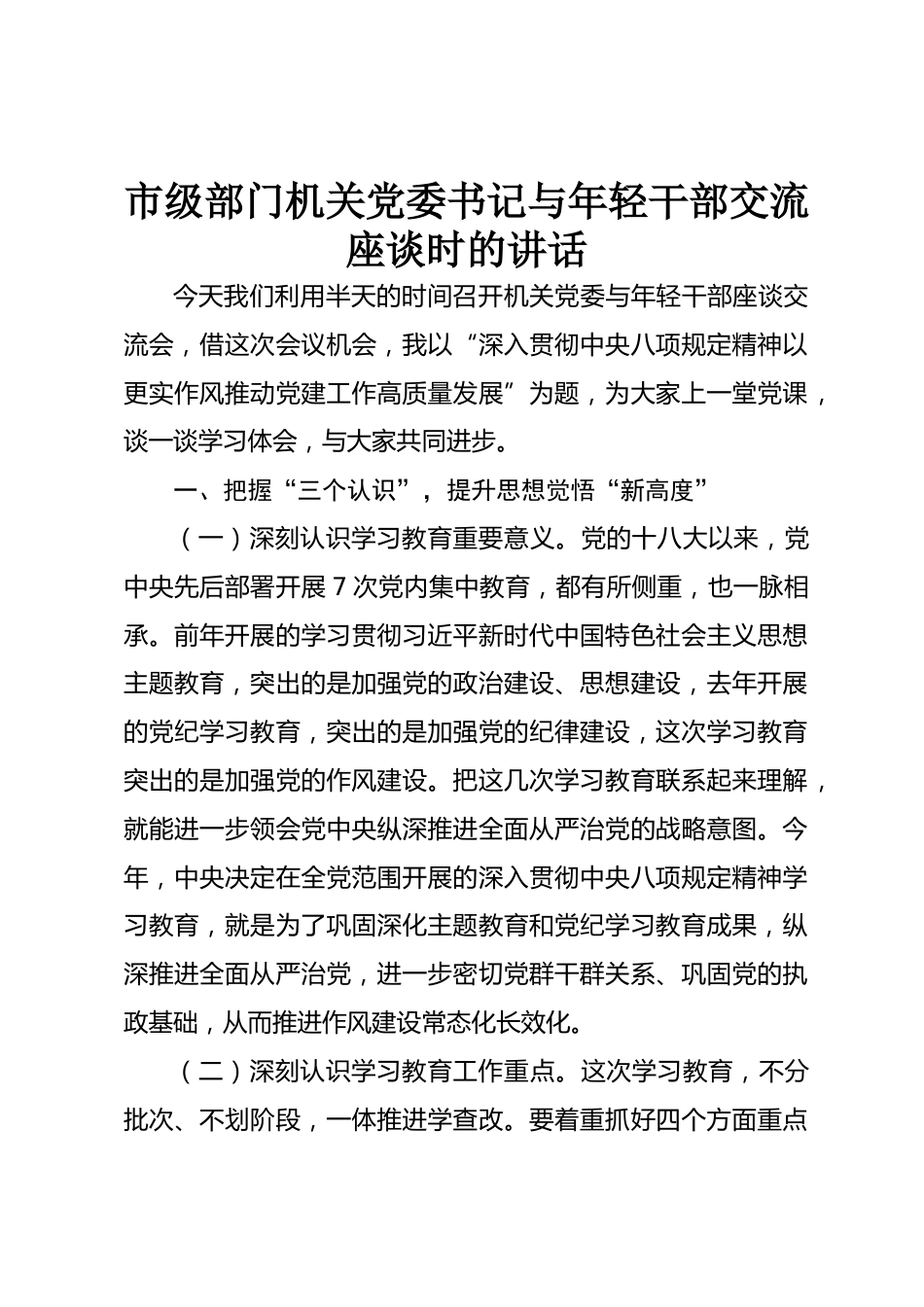 市級(jí)部門機(jī)關(guān)黨委書記與年輕干部交流座談時(shí)的講話今天我們利用半天的時(shí)間召開機(jī)關(guān)黨委與年輕干部座談交流會(huì),借這次會(huì)議機(jī)會(huì),我以“深入貫徹中央八項(xiàng)規(guī)定精神以更實(shí)作風(fēng)推動(dòng)黨建工作高質(zhì)量發(fā)展”為題,為大家上一堂黨課,談一談學(xué)習(xí)體會(huì),與大家共同進(jìn)步。一、把握“三個(gè)認(rèn)識(shí)”,提升思想覺(jué)悟“新高度”(一)深刻認(rèn)識(shí)學(xué)習(xí)教育重要意義。黨的十八大以來(lái),黨中央先后部署開展7次黨內(nèi)集中教育,都有所側(cè)重,也一脈相承。前年開展的學(xué)習(xí)貫徹習(xí)近平新時(shí)代中國(guó)特色社會(huì)主義思想主題教育,突出的是加強(qiáng)黨的政治建設(shè)、思想建設(shè),去年開展的黨紀(jì)學(xué)習(xí)教育,突出的是加強(qiáng)黨的紀(jì)律...