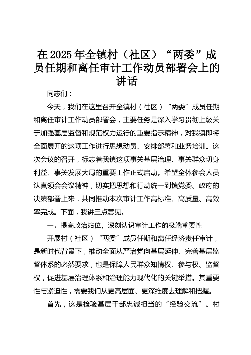 在2025年全鎮(zhèn)村(社區(qū))“兩委”成員任期和離任審計工作動員部署會上的講話