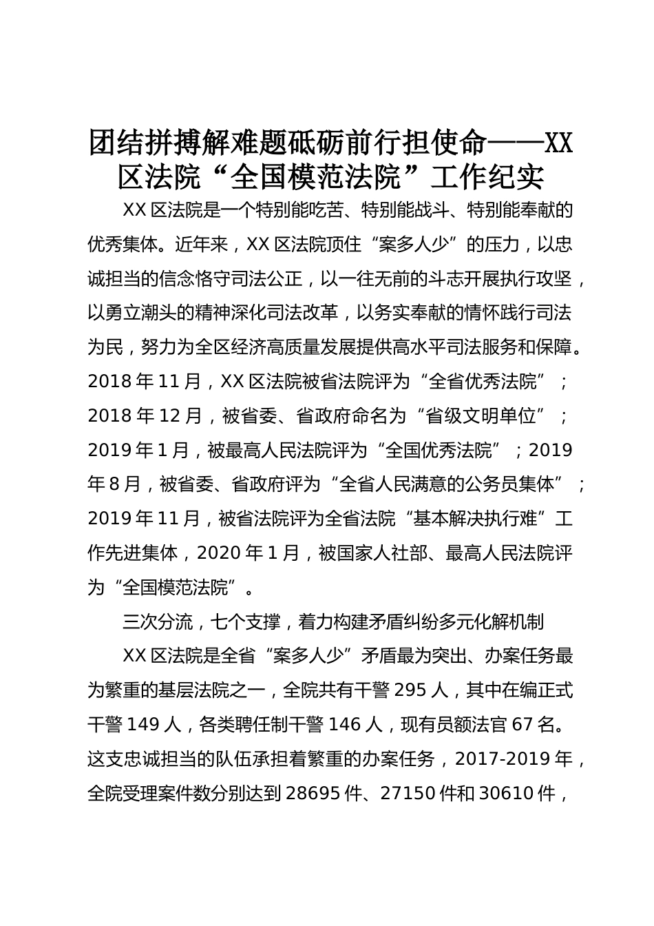 團(tuán)結(jié)拼搏解難題砥礪前行擔(dān)使命——XX區(qū)法院“全國模范法院”工作紀(jì)實(shí)XX區(qū)法院是一個(gè)特別能吃苦、特別能戰(zhàn)斗、特別能奉獻(xiàn)的優(yōu)秀集體。近年來,XX區(qū)法院頂住“案多人少”的壓力,以忠誠擔(dān)當(dāng)?shù)男拍钽∈厮痉ü砸煌鶡o前的斗志開展執(zhí)行攻堅(jiān),以勇立潮頭的精神深化司法改革,以務(wù)實(shí)奉獻(xiàn)的情懷踐行司法為民,努力為全區(qū)經(jīng)濟(jì)高質(zhì)量發(fā)展提供高水平司法服務(wù)和保障。2018年11月,XX區(qū)法院被省法院評(píng)為“全省優(yōu)秀法院”;2018年12月,被省委、省政府命名為“省級(jí)文明單位”;2019年1月,被最高人民法院評(píng)為“全國優(yōu)秀法院”;2019年8月,被省委、省政府評(píng)為“全省人民滿意的公務(wù)...