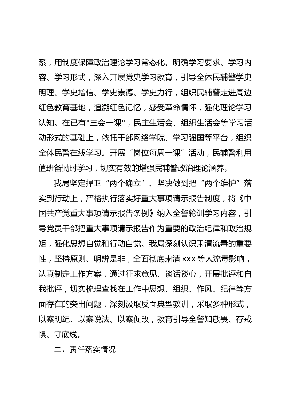 某縣公安局關(guān)于貫徹落實《中國共產(chǎn)黨政法工作條例》“回頭看”工作情況的報告自《中國共產(chǎn)黨政法工作條例》頒布以來,我局始終堅持以*******為指導(dǎo),深入貫徹《中國共產(chǎn)黨政法工作條例》以及中央、省委決策部署,自覺站在增強(qiáng)“四個意識”、堅定“四個自信”、做到“兩個維護(hù)”的高度,把黨的絕對領(lǐng)導(dǎo)貫徹到全局工作的各方面和全過程,強(qiáng)化忠誠教育,加強(qiáng)從嚴(yán)管黨治警,確保學(xué)習(xí)入心入腦、思想堅決堅定、措施從嚴(yán)從實,各項決策部署不折不扣貫徹落實。一、政治建設(shè)情況《條例》頒布以來,我局黨委高度重視,多次召開黨委會理論中心組學(xué)習(xí)會,進(jìn)行學(xué)習(xí)研究《條例》有關(guān)精...