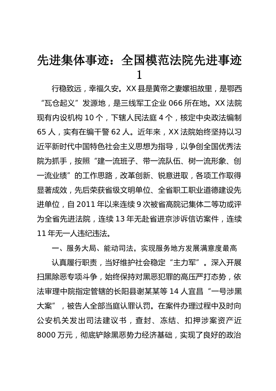 先進(jìn)集體事跡:全國模范法院先進(jìn)事跡1行穩(wěn)致遠(yuǎn),幸福久安。XX縣是黃帝之妻嫘祖故里,是鄂西“瓦倉起義”發(fā)源地,是三線軍工企業(yè)066所在地。XX法院現(xiàn)有內(nèi)設(shè)機(jī)構(gòu)10個,下轄人民法庭4個,核定中央政法編制65人,實有在編干警62人。近年來,XX法院始終堅持以習(xí)近平新時代中國特色社會主義思想為指導(dǎo),以爭創(chuàng)全國優(yōu)秀法院為抓手,按照“建一流班子、帶一流隊伍、樹一流形象、創(chuàng)一流業(yè)績”的工作思路,改革創(chuàng)新、銳意進(jìn)取,各項工作取得顯著成效,先后榮獲省級文明單位、全省職工職業(yè)道德建設(shè)先進(jìn)單位,自2011年以來連續(xù)9次被省高院記集體二等功或評為全省先進(jìn)法院,連續(xù)13年無...