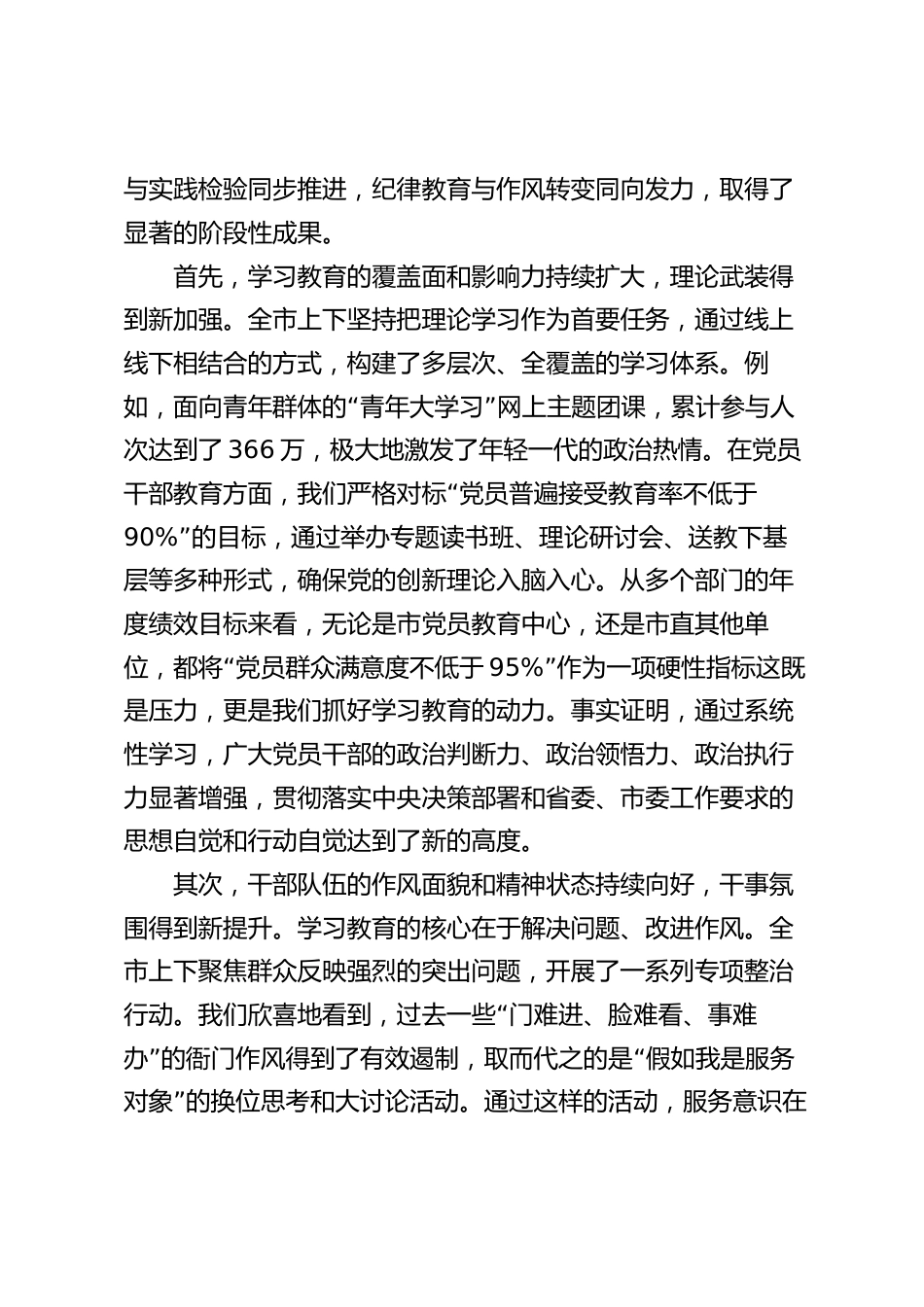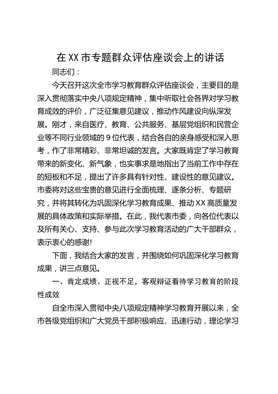 在XX市專題群眾評(píng)估座談會(huì)上的講話同志們:今天召開這次全市學(xué)習(xí)教育群眾評(píng)估座談會(huì),主要目的是深入貫徹落實(shí)中央八項(xiàng)規(guī)定精神,集中聽取社會(huì)各界對(duì)學(xué)習(xí)教育成效的評(píng)價(jià),廣泛征集意見(jiàn)建議,推動(dòng)作風(fēng)建設(shè)向縱深發(fā)展。剛才,來(lái)自醫(yī)療、教育、公共服務(wù)、基層黨組織和民營(yíng)企業(yè)等不同行業(yè)領(lǐng)域的9位代表,結(jié)合各自的親身感受和深入思考,作了非常精彩、非常坦誠(chéng)的發(fā)言。大家既肯定了學(xué)習(xí)教育帶來(lái)的新變化、新氣象,也實(shí)事求是地指出了當(dāng)前工作中存在的短板和不足,提出了許多具有針對(duì)性、建設(shè)性的意見(jiàn)建議。市委將對(duì)這些寶貴的意見(jiàn)進(jìn)行全面梳理、逐條分析、專題研究,并將其轉(zhuǎn)...