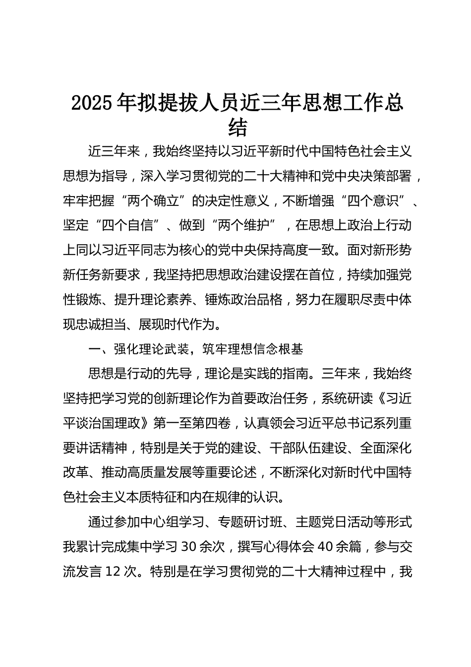 2025年擬提拔人員近三年思想工作總結(jié)近三年來,我始終堅持以習(xí)近平新時代中國特色社會主義思想為指導(dǎo),深入學(xué)習(xí)貫徹黨的二十大精神和黨中央決策部署,牢牢把握“兩個確立”的決定性意義,不斷增強(qiáng)“四個意識”、堅定“四個自信”、做到“兩個維護(hù)”,在思想上政治上行動上同以習(xí)近平同志為核心的黨中央保持高度一致。面對新形勢新任務(wù)新要求,我堅持把思想政治建設(shè)擺在首位,持續(xù)加強(qiáng)黨性鍛煉、提升理論素養(yǎng)、錘煉政治品格,努力在履職盡責(zé)中體現(xiàn)忠誠擔(dān)當(dāng)、展現(xiàn)時代作為。一、強(qiáng)化理論武裝,筑牢理想信念根基思想是行動的先導(dǎo),理論是實踐的指南。三年來,我始終堅持把學(xué)...