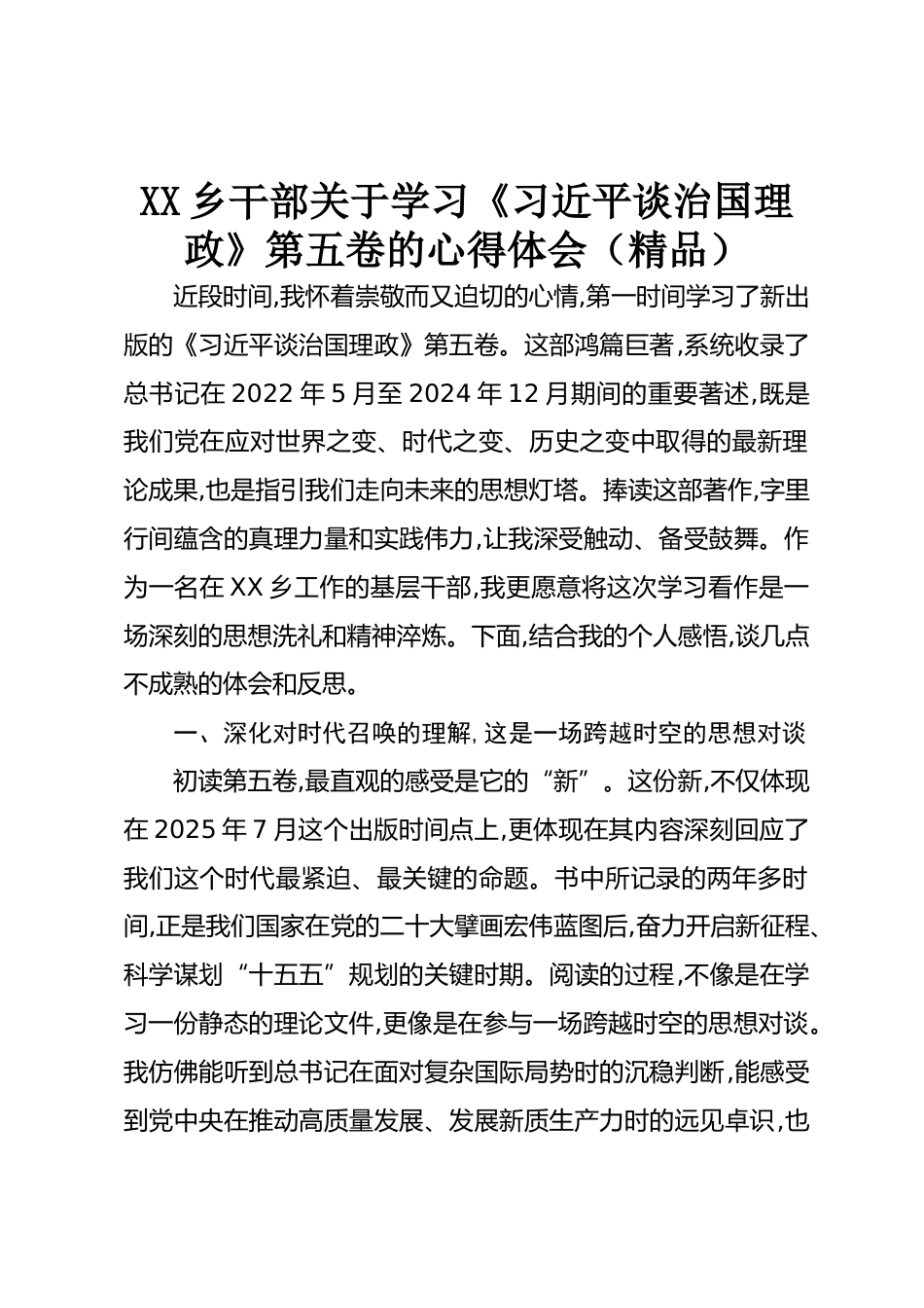 XX鄉(xiāng)干部關(guān)于學(xué)習(xí)《習(xí)近平談治國(guó)理政》第五卷的心得體會(huì)(精品)近段時(shí)間,我懷著崇敬而又迫切的心情,第一時(shí)間學(xué)習(xí)了新出版的《習(xí)近平談治國(guó)理政》第五卷。這部鴻篇巨著,系統(tǒng)收錄了總書(shū)記在2022年5月至2024年12月期間的重要著述,既是我們黨在應(yīng)對(duì)世界之變、時(shí)代之變、歷史之變中取得的最新理論成果,也是指引我們走向未來(lái)的思想燈塔。捧讀這部著作,字里行間蘊(yùn)含的真理力量和實(shí)踐偉力,讓我深受觸動(dòng)、備受鼓舞。作為一名在XX鄉(xiāng)工作的基層干部,我更愿意將這次學(xué)習(xí)看作是一場(chǎng)深刻的思想洗禮和精神淬煉。下面,結(jié)合我的個(gè)人感悟,談幾點(diǎn)不成熟的體會(huì)和反思。一、深化對(duì)時(shí)代召喚的...
