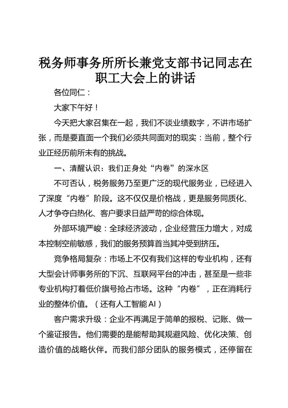 稅務(wù)師事務(wù)所所長(zhǎng)兼黨支部書(shū)記同志在職工大會(huì)上的講話各位同仁:大家下午好!今天把大家召集在一起,我們不談業(yè)績(jī)數(shù)字,不講市場(chǎng)擴(kuò)張,而是要直面一個(gè)我們必須共同面對(duì)的現(xiàn)實(shí):當(dāng)前,整個(gè)行業(yè)正經(jīng)歷前所未有的挑戰(zhàn)。一、清醒認(rèn)識(shí):我們正身處“內(nèi)卷”的深水區(qū)不可否認(rèn),稅務(wù)服務(wù)乃至更廣泛的現(xiàn)代服務(wù)業(yè),已經(jīng)進(jìn)入了深度“內(nèi)卷”階段。這不僅僅是價(jià)格戰(zhàn),更是服務(wù)同質(zhì)化、人才爭(zhēng)奪白熱化、客戶要求日益嚴(yán)苛的綜合體現(xiàn)。外部環(huán)境嚴(yán)峻:全球經(jīng)濟(jì)波動(dòng),企業(yè)經(jīng)營(yíng)壓力增大,對(duì)成本控制空前敏感,我們的服務(wù)預(yù)算首當(dāng)其沖受到擠壓。競(jìng)爭(zhēng)格局復(fù)雜:市場(chǎng)上不僅有我們這樣的專業(yè)機(jī)構(gòu)...