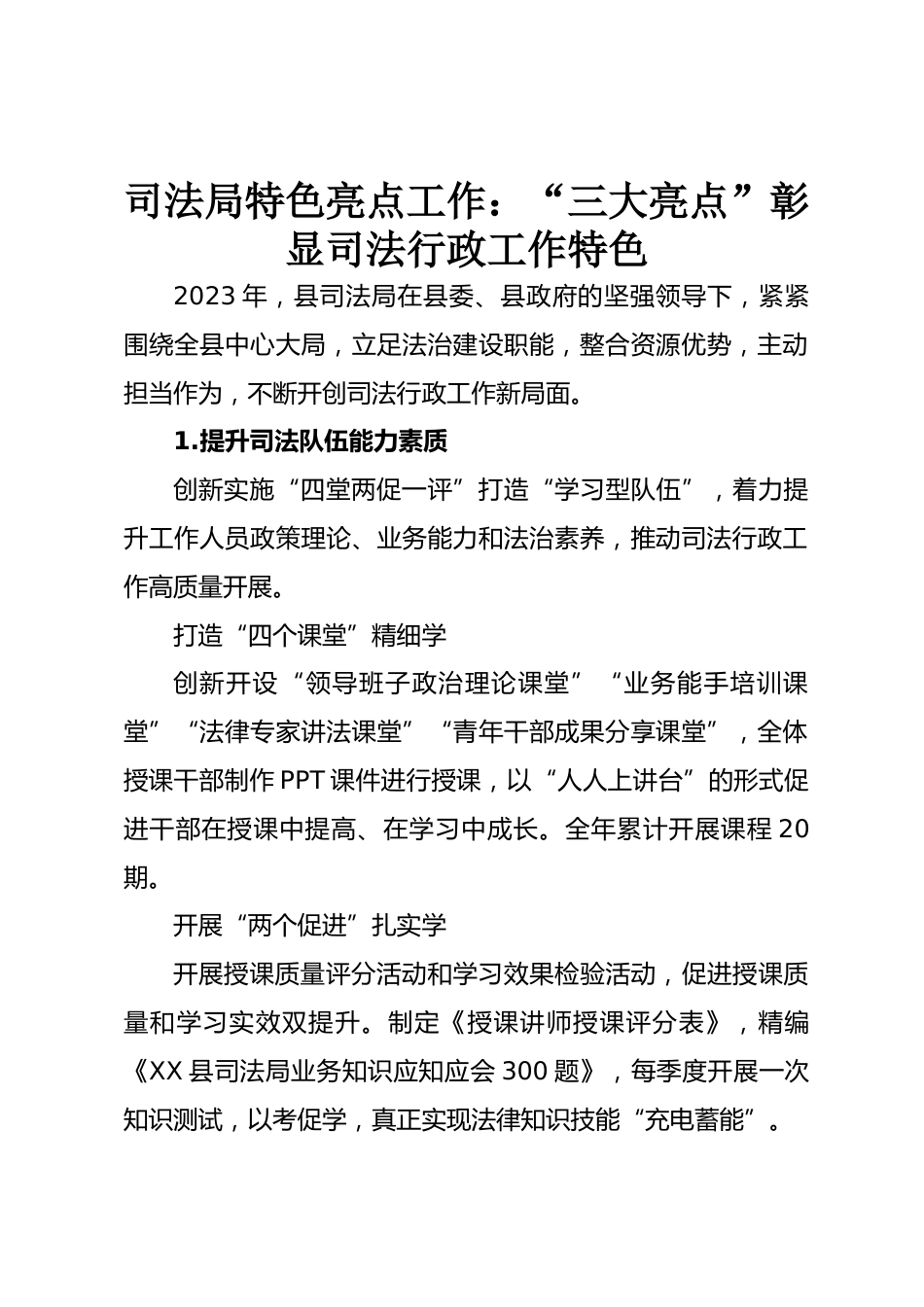 司法局特色亮點工作:“三大亮點”彰顯司法行政工作特色2023年,縣司法局在縣委、縣政府的堅強領導下,緊緊圍繞全縣中心大局,立足法治建設職能,整合資源優(yōu)勢,主動擔當作為,不斷開創(chuàng)司法行政工作新局面。1.提升司法隊伍能力素質創(chuàng)新實施“四堂兩促一評”打造“學習型隊伍”,著力提升工作人員政策理論、業(yè)務能力和法治素養(yǎng),推動司法行政工作高質量開展。打造“四個課堂”精細學創(chuàng)新開設“領導班子政治理論課堂”“業(yè)務能手培訓課堂”“法律專家講法課堂”“青年干部成果分享課堂”,全體授課干部制作PPT課件進行授課,以“人人上講臺”的形式促進干部在授課中提高、...