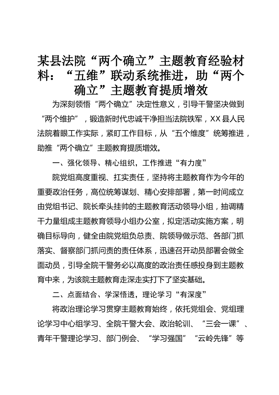 某縣法院“兩個(gè)確立”主題教育經(jīng)驗(yàn)材料:“五維”聯(lián)動(dòng)系統(tǒng)推進(jìn),助“兩個(gè)確立”主題教育提質(zhì)增效為深刻領(lǐng)悟“兩個(gè)確立”決定性意義,引導(dǎo)干警堅(jiān)決做到“兩個(gè)維護(hù)”,鍛造新時(shí)代忠誠(chéng)干凈擔(dān)當(dāng)法院鐵軍,XX縣人民法院著眼工作實(shí)際,緊盯工作目標(biāo),從“五個(gè)維度”統(tǒng)籌推進(jìn),助推“兩個(gè)確立”主題教育提質(zhì)增效。一、強(qiáng)化領(lǐng)導(dǎo)、精心組織,工作推進(jìn)“有力度”院黨組高度重視、扛實(shí)責(zé)任,堅(jiān)持將主題教育作為今年的重要政治任務(wù),高位統(tǒng)籌謀劃、精心安排部署,第一時(shí)間成立由黨組書(shū)記、院長(zhǎng)牽頭掛帥的主題教育活動(dòng)領(lǐng)導(dǎo)小組,抽調(diào)精干力量組成主題教育領(lǐng)導(dǎo)小組辦公室,擬定活動(dòng)實(shí)施...