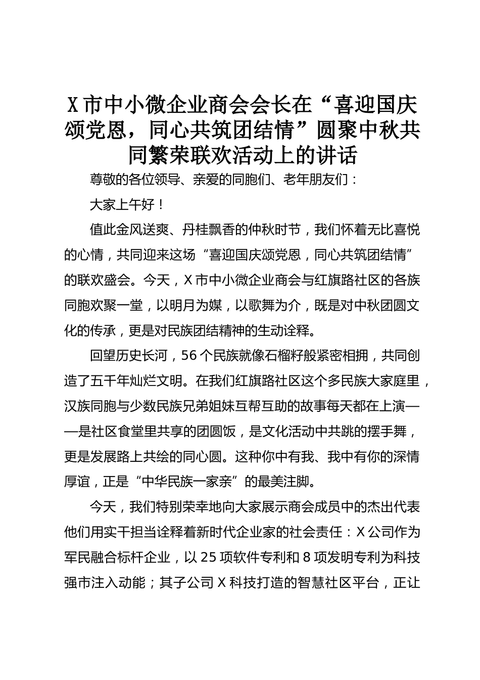 X市中小微企業(yè)商會(huì)會(huì)長(zhǎng)在“喜迎國(guó)慶頌黨恩,同心共筑團(tuán)結(jié)情”圓聚中秋共同繁榮聯(lián)歡活動(dòng)上的講話