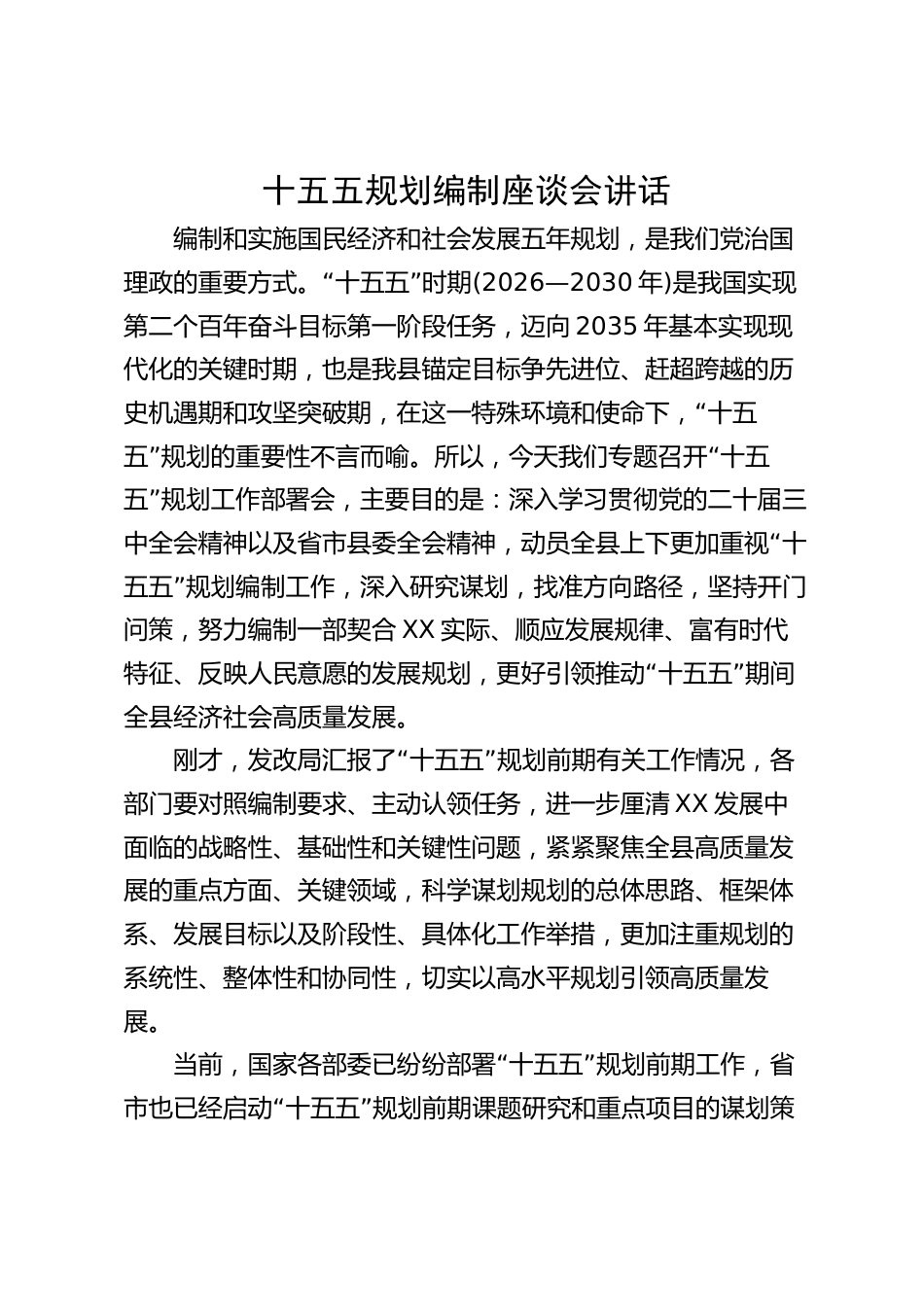 十五五規(guī)劃編制座談會(huì)講話編制和實(shí)施國(guó)民經(jīng)濟(jì)和社會(huì)發(fā)展五年規(guī)劃,是我們黨治國(guó)“”理政的重要方式。十五五時(shí)期(2026—2030年)是我國(guó)實(shí)現(xiàn)第二個(gè)百年奮斗目標(biāo)第一階段任務(wù),邁向2035年基本實(shí)現(xiàn)現(xiàn)代化的關(guān)鍵時(shí)期,也是我縣錨定目標(biāo)爭(zhēng)先進(jìn)位、趕超跨越的歷“史機(jī)遇期和攻堅(jiān)突破期,在這一特殊環(huán)境和使命下,十五”“五規(guī)劃的重要性不言而喻。所以,今天我們專題召開十五”五規(guī)劃工作部署會(huì),主要目的是:深入學(xué)習(xí)貫徹黨的二十屆三“中全會(huì)精神以及省市縣委全會(huì)精神,動(dòng)員全縣上下更加重視十”五五規(guī)劃編制工作,深入研究謀劃,找準(zhǔn)方向路徑,堅(jiān)持開門問(wèn)策,努力編制一部契合...