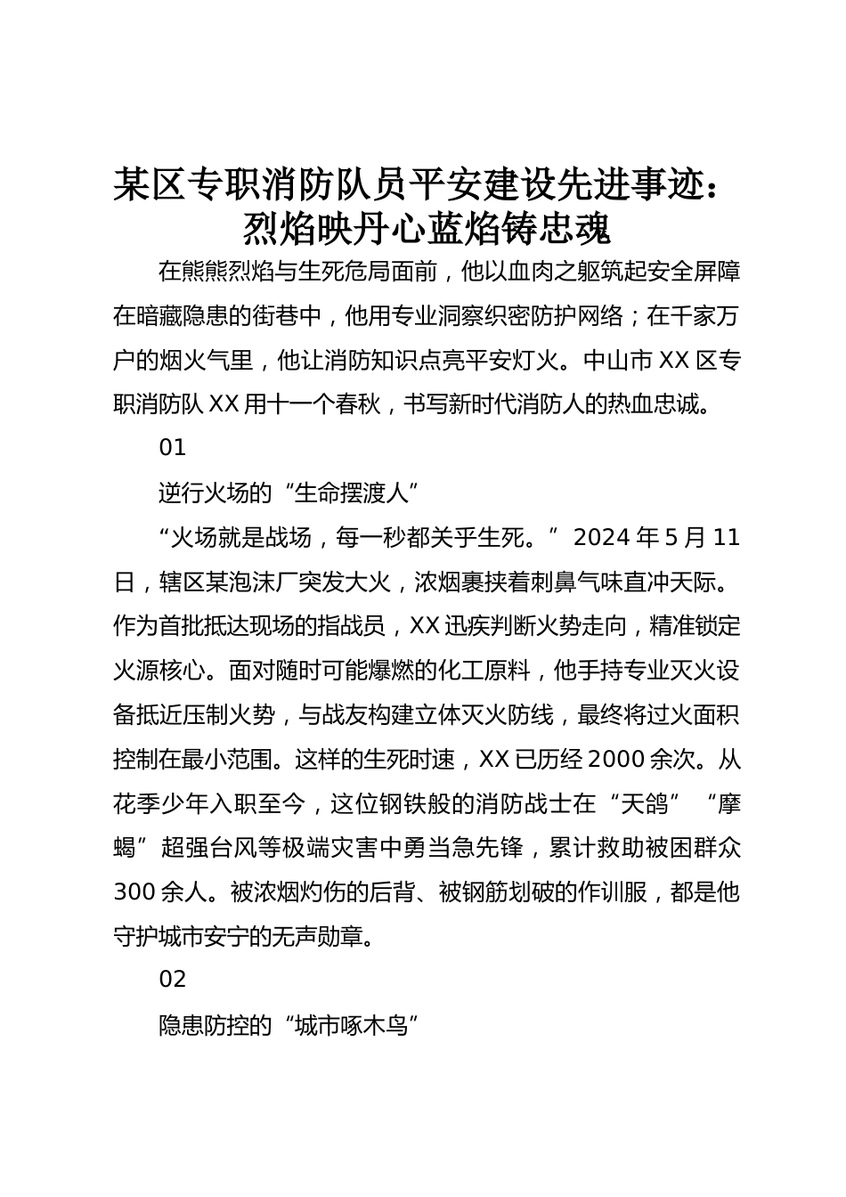 某區(qū)專職消防隊(duì)員平安建設(shè)先進(jìn)事跡:烈焰映丹心藍(lán)焰鑄忠魂在熊熊烈焰與生死危局面前,他以血肉之軀筑起安全屏障在暗藏隱患的街巷中,他用專業(yè)洞察織密防護(hù)網(wǎng)絡(luò);在千家萬戶的煙火氣里,他讓消防知識(shí)點(diǎn)亮平安燈火。中山市XX區(qū)專職消防隊(duì)XX用十一個(gè)春秋,書寫新時(shí)代消防人的熱血忠誠(chéng)。01逆行火場(chǎng)的“生命擺渡人”“火場(chǎng)就是戰(zhàn)場(chǎng),每一秒都關(guān)乎生死?!?024年5月11日,轄區(qū)某泡沫廠突發(fā)大火,濃煙裹挾著刺鼻氣味直沖天際。作為首批抵達(dá)現(xiàn)場(chǎng)的指戰(zhàn)員,XX迅疾判斷火勢(shì)走向,精準(zhǔn)鎖定火源核心。面對(duì)隨時(shí)可能爆燃的化工原料,他手持專業(yè)滅火設(shè)備抵近壓制火勢(shì),與戰(zhàn)友構(gòu)建立體滅...
