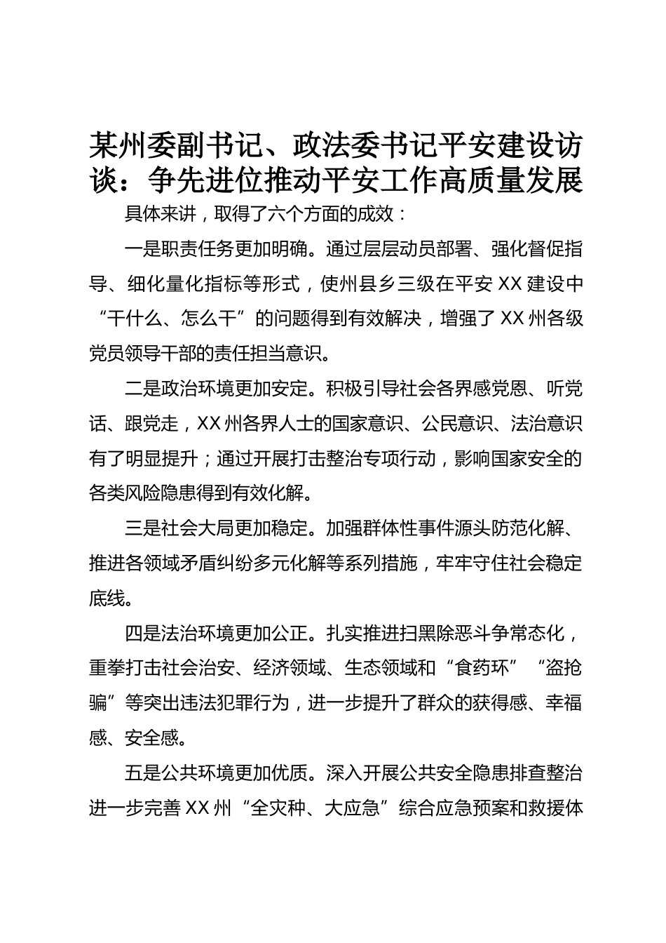 某州委副書記、政法委書記平安建設(shè)訪談:爭先進(jìn)位推動(dòng)平安工作高質(zhì)量發(fā)展具體來講,取得了六個(gè)方面的成效:一是職責(zé)任務(wù)更加明確。通過層層動(dòng)員部署、強(qiáng)化督促指導(dǎo)、細(xì)化量化指標(biāo)等形式,使州縣鄉(xiāng)三級(jí)在平安XX建設(shè)中“干什么、怎么干”的問題得到有效解決,增強(qiáng)了XX州各級(jí)黨員領(lǐng)導(dǎo)干部的責(zé)任擔(dān)當(dāng)意識(shí)。二是政治環(huán)境更加安定。積極引導(dǎo)社會(huì)各界感黨恩、聽黨話、跟黨走,XX州各界人士的國家意識(shí)、公民意識(shí)、法治意識(shí)有了明顯提升;通過開展打擊整治專項(xiàng)行動(dòng),影響國家安全的各類風(fēng)險(xiǎn)隱患得到有效化解。三是社會(huì)大局更加穩(wěn)定。加強(qiáng)群體性事件源頭防范化解、推進(jìn)各領(lǐng)域矛盾糾...
