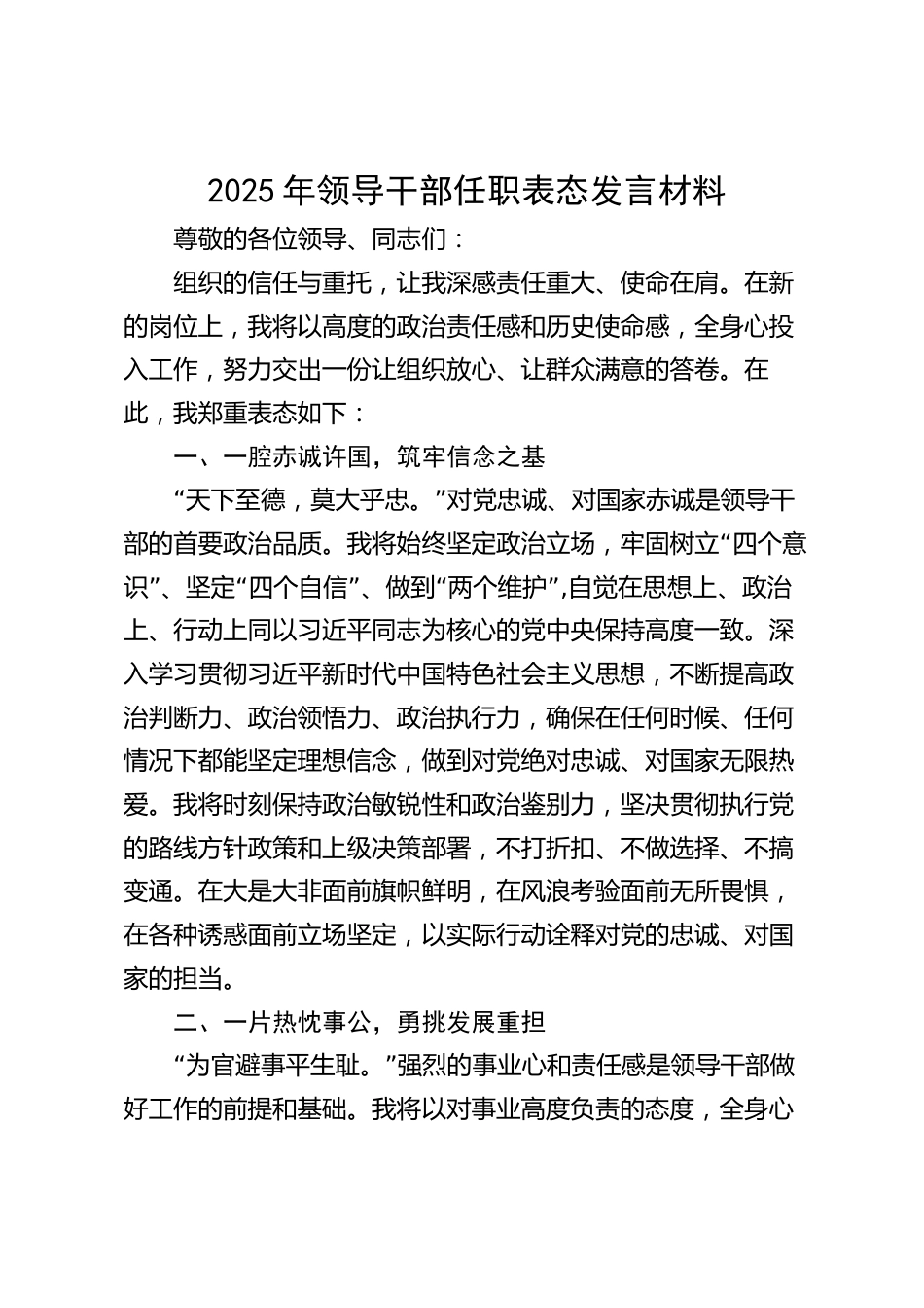 2025年領(lǐng)導(dǎo)干部任職表態(tài)發(fā)言材料尊敬的各位領(lǐng)導(dǎo)、同志們:組織的信任與重托,讓我深感責(zé)任重大、使命在肩。在新的崗位上,我將以高度的政治責(zé)任感和歷史使命感,全身心投入工作,努力交出一份讓組織放心、讓群眾滿意的答卷。在此,我鄭重表態(tài)如下:一、一腔赤誠許國,筑牢信念之基“”天下至德,莫大乎忠。對黨忠誠、對國家赤誠是領(lǐng)導(dǎo)干“部的首要政治品質(zhì)。我將始終堅定政治立場,牢固樹立四個意”“”“”識、堅定四個自信、做到兩個維護,自覺在思想上、政治上、行動上同以習(xí)近平同志為核心的黨中央保持高度一致。深入學(xué)習(xí)貫徹習(xí)近平新時代中國特色社會主義思想,不斷...