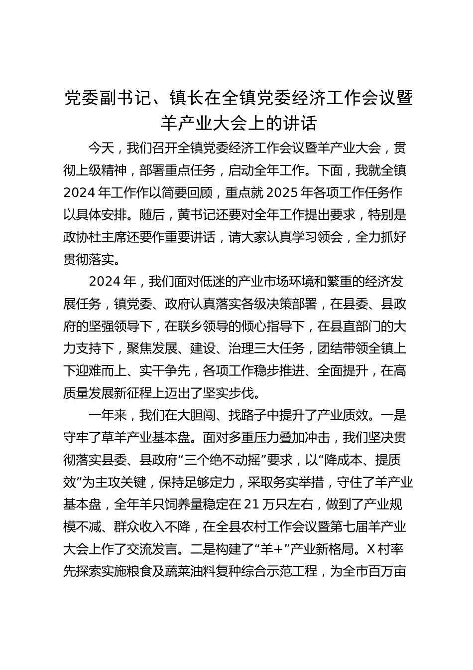 黨委副書記、鎮(zhèn)長在全鎮(zhèn)黨委經(jīng)濟(jì)工作會議暨羊產(chǎn)業(yè)大會上的講話今天,我們召開全鎮(zhèn)黨委經(jīng)濟(jì)工作會議暨羊產(chǎn)業(yè)大會,貫徹上級精神,部署重點任務(wù),啟動全年工作。下面,我就全鎮(zhèn)2024年工作作以簡要回顧,重點就2025年各項工作任務(wù)作以具體安排。隨后,黃書記還要對全年工作提出要求,特別是政協(xié)杜主席還要作重要講話,請大家認(rèn)真學(xué)習(xí)領(lǐng)會,全力抓好貫徹落實。2024年,我們面對低迷的產(chǎn)業(yè)市場環(huán)境和繁重的經(jīng)濟(jì)發(fā)展任務(wù),鎮(zhèn)黨委、政府認(rèn)真落實各級決策部署,在縣委、縣政府的堅強(qiáng)領(lǐng)導(dǎo)下,在聯(lián)鄉(xiāng)領(lǐng)導(dǎo)的傾心指導(dǎo)下,在縣直部門的大力支持下,聚焦發(fā)展、建設(shè)、治理三大任務(wù),團(tuán)結(jié)...