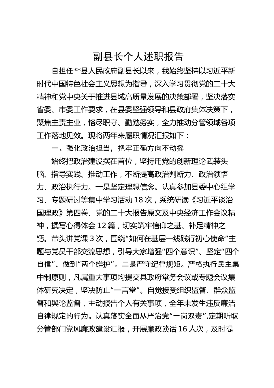 副縣長(zhǎng)個(gè)人述職報(bào)告自擔(dān)任**縣人民政府副縣長(zhǎng)以來(lái),我始終堅(jiān)持以習(xí)近平新時(shí)代中國(guó)特色社會(huì)主義思想為指導(dǎo),深入學(xué)習(xí)貫徹黨的二十大精神和黨中央關(guān)于推進(jìn)縣域高質(zhì)量發(fā)展的決策部署,堅(jiān)決落實(shí)省委、市委工作要求,在縣委堅(jiān)強(qiáng)領(lǐng)導(dǎo)和縣政府集體決策下,聚焦主責(zé)主業(yè),恪盡職守、勤勉務(wù)實(shí),全力推動(dòng)分管領(lǐng)域各項(xiàng)工作落地見(jiàn)效?,F(xiàn)將兩年來(lái)履職情況匯報(bào)如下:一、強(qiáng)化政治擔(dān)當(dāng),把牢正確方向不動(dòng)搖始終把政治建設(shè)擺在首位,堅(jiān)持用黨的創(chuàng)新理論武裝頭腦、指導(dǎo)實(shí)踐、推動(dòng)工作,不斷提高政治判斷力、政治領(lǐng)悟力、政治執(zhí)行力。一是堅(jiān)定理想信念。認(rèn)真參加縣委中心組學(xué)習(xí)、專題研討等...