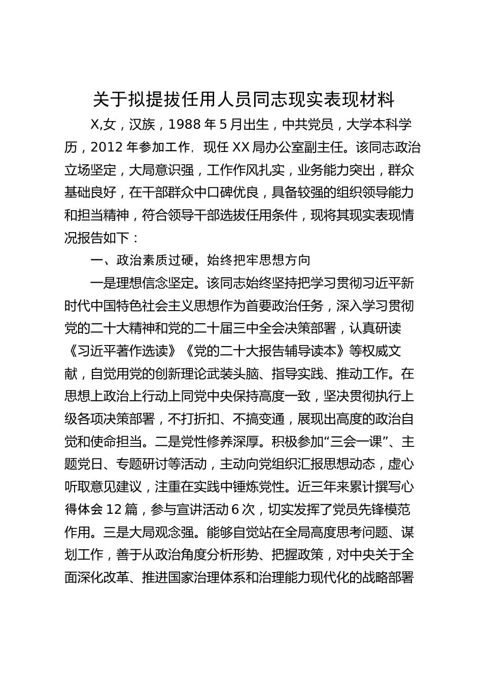 關(guān)于擬提拔任用人員同志現(xiàn)實表現(xiàn)材料X,女,漢族,1988年5月出生,中共黨員,大學本科學歷,2012年參加工作,現(xiàn)任XX局辦公室副主任。該同志政治立場堅定,大局意識強,工作作風扎實,業(yè)務(wù)能力突出,群眾基礎(chǔ)良好,在干部群眾中口碑優(yōu)良,具備較強的組織領(lǐng)導能力和擔當精神,符合領(lǐng)導干部選拔任用條件,現(xiàn)將其現(xiàn)實表現(xiàn)情況報告如下:一、政治素質(zhì)過硬,始終把牢思想方向一是理想信念堅定。該同志始終堅持把學習貫徹習近平新時代中國特色社會主義思想作為首要政治任務(wù),深入學習貫徹黨的二十大精神和黨的二十屆三中全會決策部署,認真研讀《習近平著作選讀》《黨的二十大報...