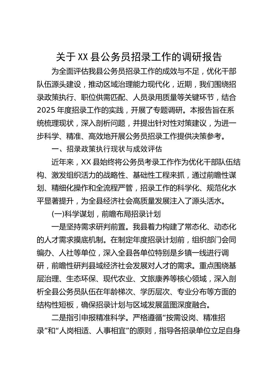 關(guān)于XX縣公務(wù)員招錄工作的調(diào)研報告為全面評估我縣公務(wù)員招錄工作的成效與不足,優(yōu)化干部隊伍源頭建設(shè),推動區(qū)域治理能力現(xiàn)代化,近期,我們圍繞招錄政策執(zhí)行、職位供需匹配、人員錄用質(zhì)量等關(guān)鍵環(huán)節(jié),結(jié)合2025年度招錄工作的實踐,開展了專題調(diào)研。本報告旨在系統(tǒng)梳理現(xiàn)狀,深入剖析問題,并提出針對性對策建議,為進一步科學、精準、高效地開展公務(wù)員招錄工作提供決策參考。一、招錄政策執(zhí)行現(xiàn)狀與成效評估近年來,XX縣始終將公務(wù)員考錄工作作為優(yōu)化干部隊伍結(jié)構(gòu)、激發(fā)組織活力的戰(zhàn)略性、基礎(chǔ)性工程來抓,通過前瞻性謀劃、精細化操作和全流程嚴管,招錄工作的科學化、規(guī)...