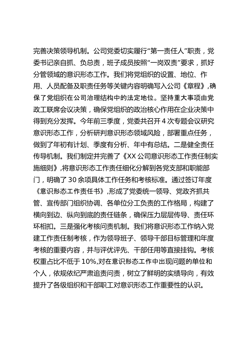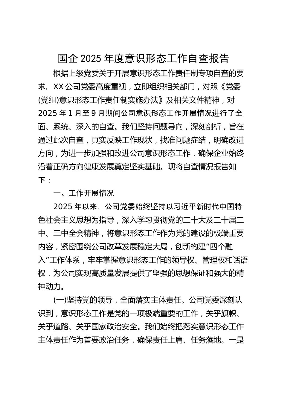 國企2025年度意識(shí)形態(tài)工作自查報(bào)告根據(jù)上級(jí)黨委關(guān)于開展意識(shí)形態(tài)工作責(zé)任制專項(xiàng)自查的要求,XX公司黨委高度重視,立即組織相關(guān)部門,對(duì)照《黨委(黨組)意識(shí)形態(tài)工作責(zé)任制實(shí)施辦法》及相關(guān)文件精神,對(duì)2025年1月至9月期公司意形工作開展情況行了全間識(shí)態(tài)進(jìn)面、系統(tǒng)、深入的自查。我們堅(jiān)持問題導(dǎo)向,深刻剖析,旨在通過此次自查,真實(shí)反映工作現(xiàn)狀,找準(zhǔn)問題癥結(jié),明確改進(jìn)方向,為進(jìn)一步加強(qiáng)和改進(jìn)公司意識(shí)形態(tài)工作,確保企業(yè)始終沿著正確方向健康發(fā)展奠定堅(jiān)實(shí)基礎(chǔ)?,F(xiàn)將自查情況報(bào)告如下:一、工作開展情況2025年以來,公司黨委始持以近平新代中國特終堅(jiān)習(xí)時(shí)色社會(huì)主義思...