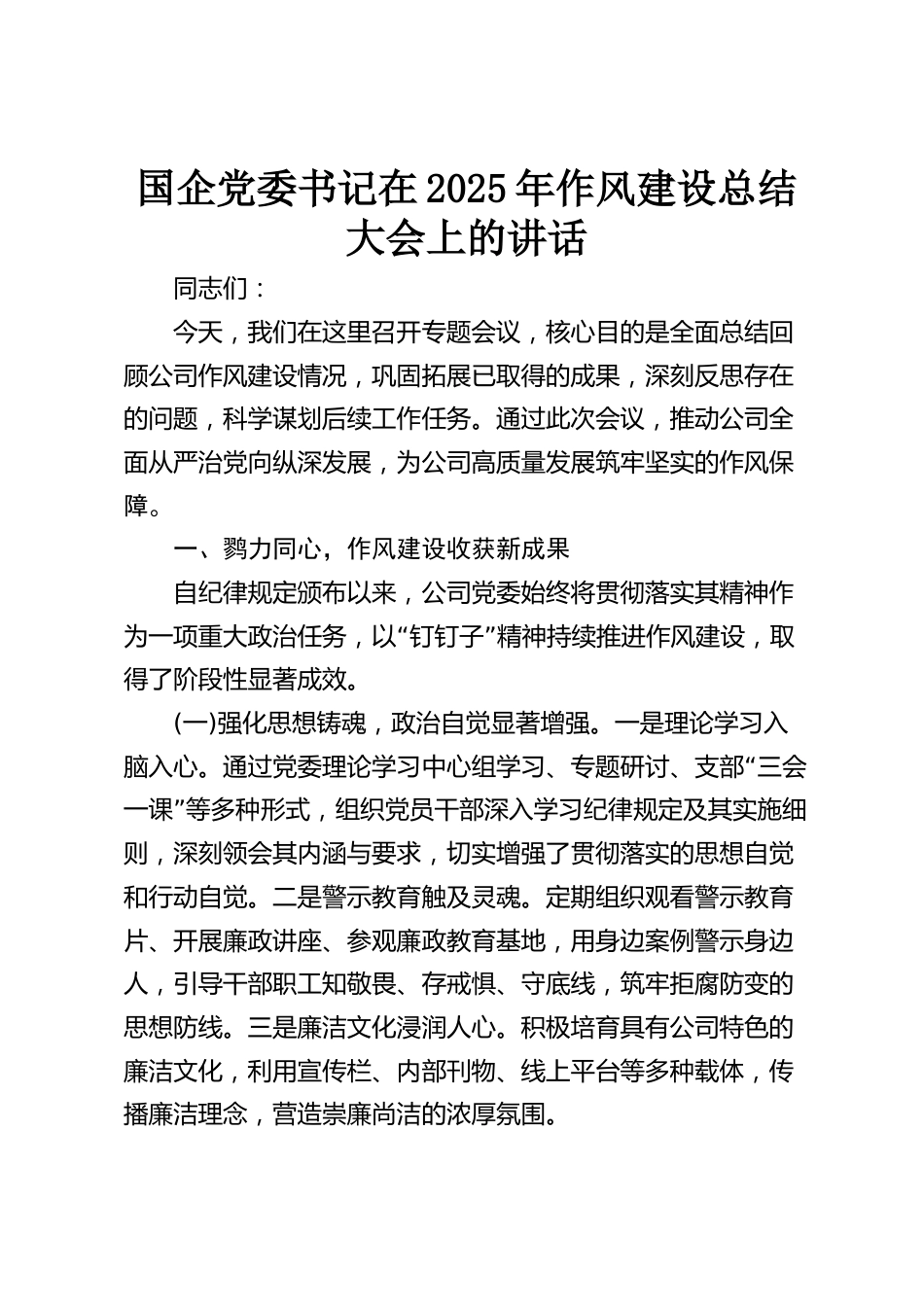 國企黨委書記在2025年作風(fēng)建設(shè)總結(jié)大會上的講話同志們:今天,我們在這里召開專題會議,核心目的是全面總結(jié)回顧公司作風(fēng)建設(shè)情況,鞏固拓展已取得的成果,深刻反思存在的問題,科學(xué)謀劃后續(xù)工作任務(wù)。通過此次會議,推動公司全面從嚴治黨向縱深發(fā)展,為公司高質(zhì)量發(fā)展筑牢堅實的作風(fēng)保障。一、鷚力同心,作風(fēng)建設(shè)收獲新成果自紀律規(guī)定頒布以來,公司黨委始終將貫徹落實其精神作“”為一項重大政治任務(wù),以釘釘子精神持續(xù)推進作風(fēng)建設(shè),取得了階段性顯著成效。(一)強化思想鑄魂,政治自覺顯著增強。一是理論學(xué)習(xí)入“腦入心。通過黨委理論學(xué)習(xí)中心組學(xué)習(xí)、專題研討、支部三...