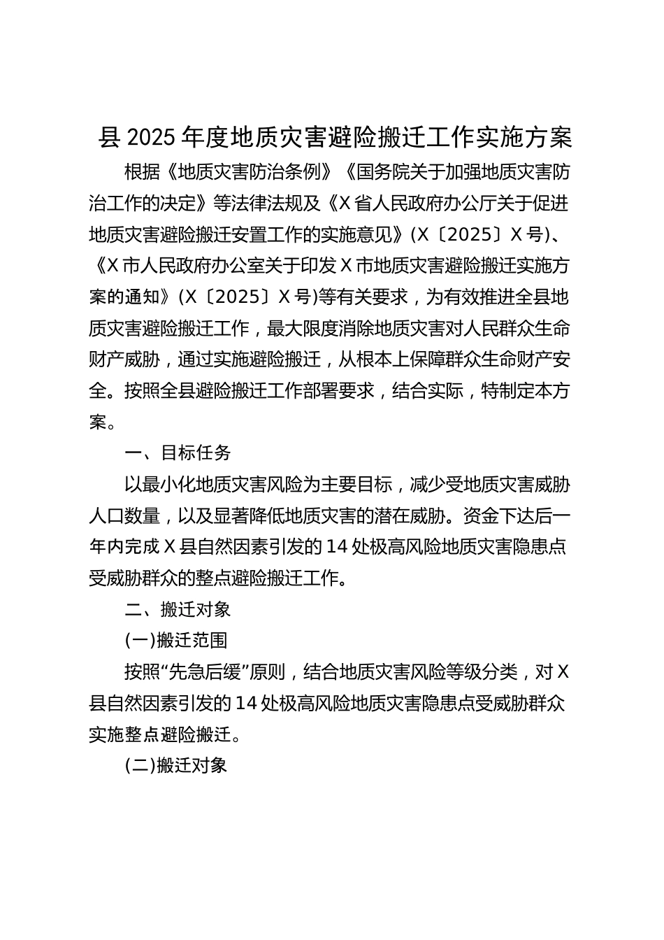 縣2025年度地質災害避險搬遷工作實施方案根據《地質災害防治條例》《國務院關于加強地質災害防治工作的決定》等法律法規(guī)及《X省人民政府辦公廳關于促進地質災害避險搬遷安置工作的實施意見》(X〔2025〕X號)、《X市人民政府辦公室關于印發(fā)X市地質災害避險搬遷實施方案的通知》(X〔2025〕X號)等有關要求,為有效推進全縣地質災害避險搬遷工作,最大限度消除地質災害對人民群眾生命財產威脅,通過實施避險搬遷,從根本上保障群眾生命財產安全。按照全縣避險搬遷工作部署要求,結合實際,特制定本方案。一、目標任務以最小化地質災害風險為主要目標,減少受地質災害威脅人口...