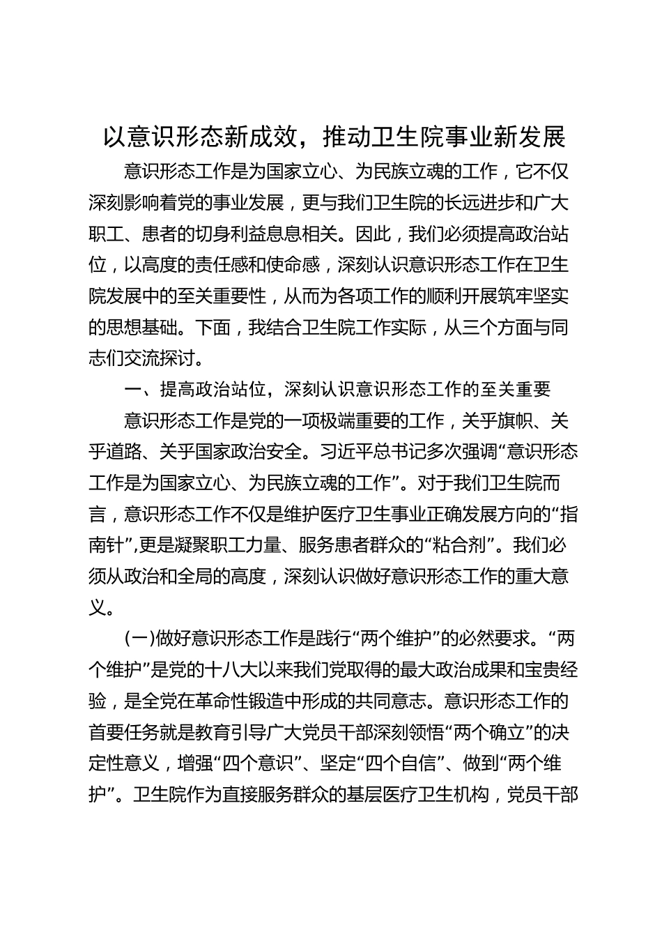 以意識形態(tài)新成效,推動衛(wèi)生院事業(yè)新發(fā)展意識形態(tài)工作是為國家立心、為民族立魂的工作,它不僅深刻影響著黨的事業(yè)發(fā)展,更與我們衛(wèi)生院的長遠(yuǎn)進(jìn)步和廣大職工、患者的切身利益息息相關(guān)。因此,我們必須提高政治站位,以高度的責(zé)任感和使命感,深刻認(rèn)識意識形態(tài)工作在衛(wèi)生院發(fā)展中的至關(guān)重要性,從而為各項工作的順利開展筑牢堅實(shí)的思想基礎(chǔ)。下面,我結(jié)合衛(wèi)生院工作實(shí)際,從三個方面與同志們交流探討。一、提高政治站位,深刻認(rèn)識意識形態(tài)工作的至關(guān)重要意識形態(tài)工作是黨的一項極端重要的工作,關(guān)乎旗幟、關(guān)“乎道路、關(guān)乎國家政治安全。習(xí)近平總書記多次強(qiáng)調(diào)意識形態(tài)”工...