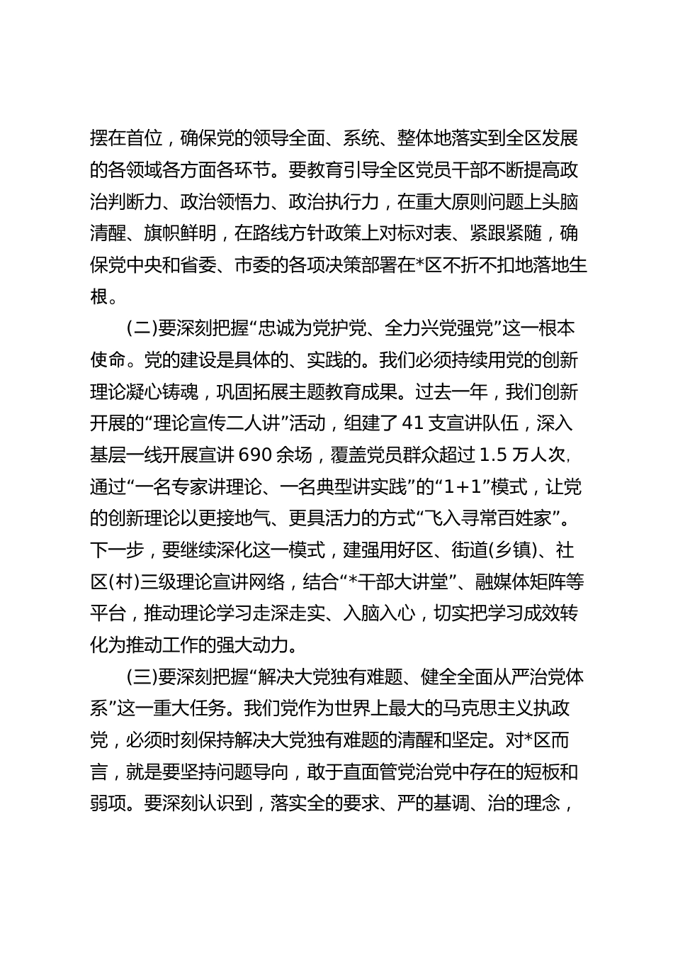 在2025年全區(qū)黨的建設(shè)工作會議上的講話同志們:今天,我們召開全區(qū)黨的建設(shè)工作會議,主要任務(wù)是深入學(xué)習(xí)貫徹習(xí)近平總書記關(guān)于黨的建設(shè)的重要思想,全面落實中央和省委、市委關(guān)于黨建工作的最新部署,總結(jié)分析當前我區(qū)黨建工作形勢,研究部署下一階段重點任務(wù),以更高標準、更嚴要求、更實舉動,推動全面從嚴治黨向縱深發(fā)展,為奮力譜寫*區(qū)高質(zhì)量發(fā)展和現(xiàn)代化建設(shè)新篇章提供堅強政治保證。下面,我講三點意見。一、深化思想認識,以更高站位把握新時代黨的建設(shè)總要求“黨的十八大以來,習(xí)近平總書記圍繞建設(shè)什么樣的長期執(zhí)”政的馬克思主義政黨、怎樣建設(shè)長期執(zhí)政的馬克...