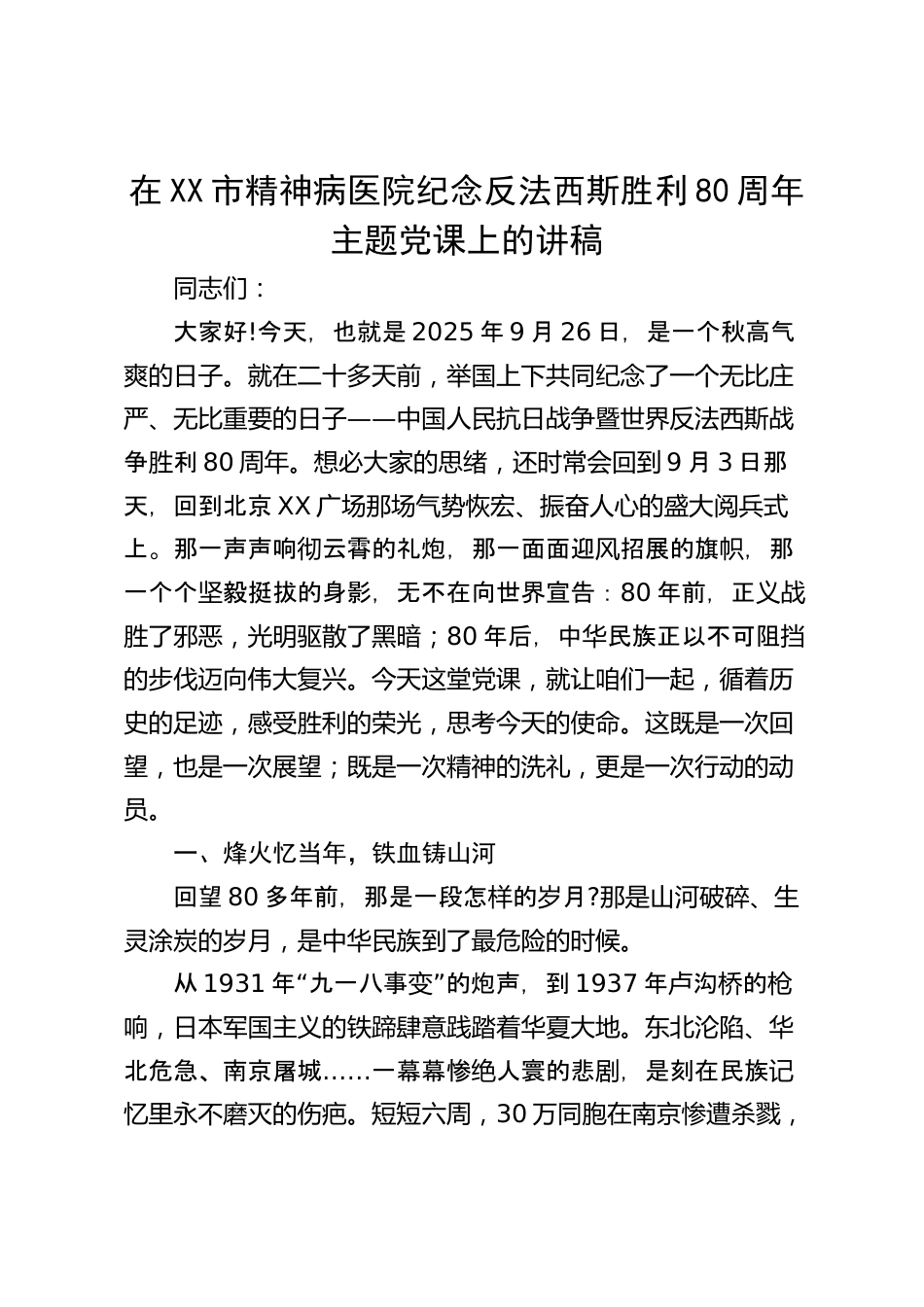 在2025年全市精神病醫(yī)院紀(jì)念反法西斯勝利80周年主題黨課上的講稿