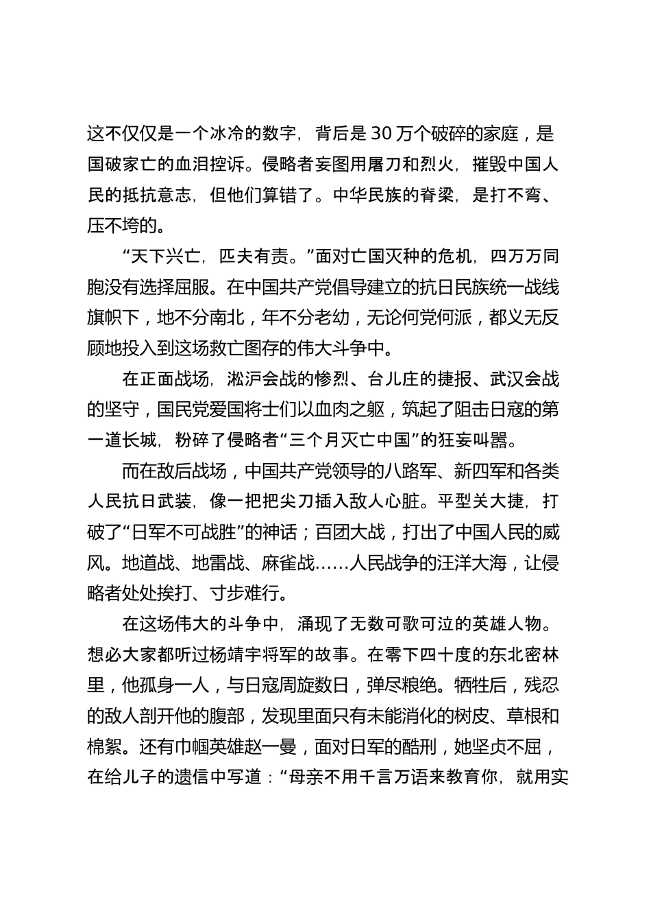 在XX市精神病醫(yī)院紀(jì)念反法西斯勝利80周年主題黨課上的講稿同志們:大家好!今天,也就是2025年9月26日,是一個(gè)秋高氣爽的日子。就在二十多天前,舉國上下共同紀(jì)念了一個(gè)無比莊嚴(yán)、無比重要的日子——中國人民抗日戰(zhàn)爭(zhēng)暨世界反法西斯戰(zhàn)爭(zhēng)勝利80周年。想必大家的思緒,還時(shí)常會(huì)回到9月3日那天,回到北京XX廣場(chǎng)那場(chǎng)氣勢(shì)恢宏、振奮人心的盛大閱兵式上。那一聲聲響云霄的禮炮,那一面面迎招展的旗,那徹風(fēng)幟一個(gè)個(gè)堅(jiān)毅挺拔的身影,無不在向世界宣告:80年前,正義戰(zhàn)勝了邪惡,光明驅(qū)散了黑暗;80年后,中華民族正以不可阻擋的步伐邁向偉大復(fù)興。今天這堂黨課,就讓咱們一起,循...