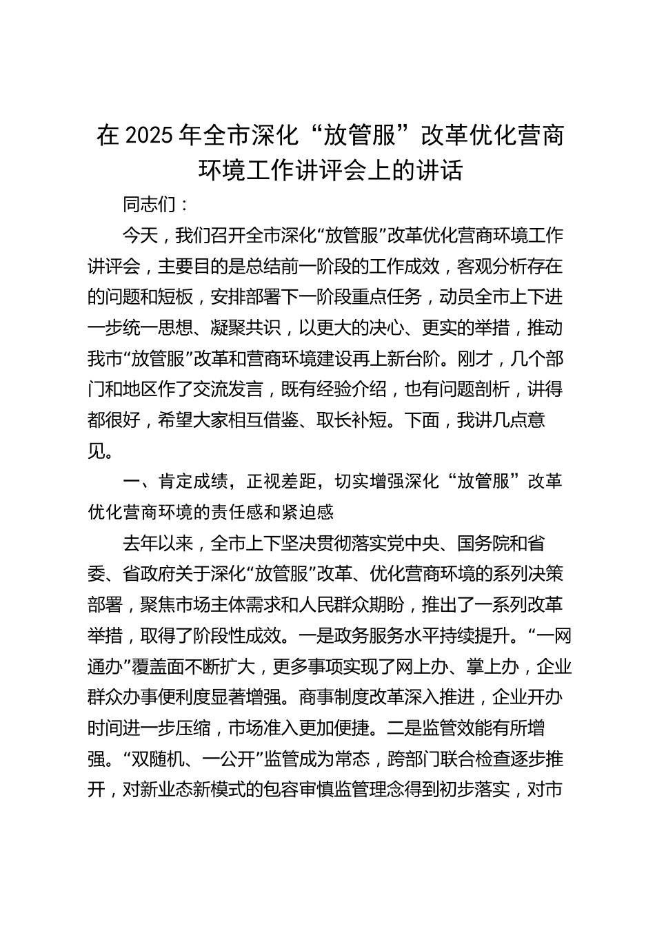 在2025年全市深化“放管服”改革優(yōu)化營商環(huán)境工作講評會上的講話同志們:“”今天,我們召開全市深化放管服改革優(yōu)化營商環(huán)境工作講評會,主要目的是總結前一階段的工作成效,客觀分析存在的問題和短板,安排部署下一階段重點任務,動員全市上下進一步統(tǒng)一思想、凝聚共識,以更大的決心、更實的舉措,推動“”我市放管服改革和營商環(huán)境建設再上新臺階。剛才,幾個部門和地區(qū)作了交流發(fā)言,既有經(jīng)驗介紹,也有問題剖析,講得都很好,希望大家相互借鑒、取長補短。下面,我講幾點意見。一、肯定成績,正視差距,切實增強深化“放管服”改革優(yōu)化營商環(huán)境的責任感和緊迫感去年...