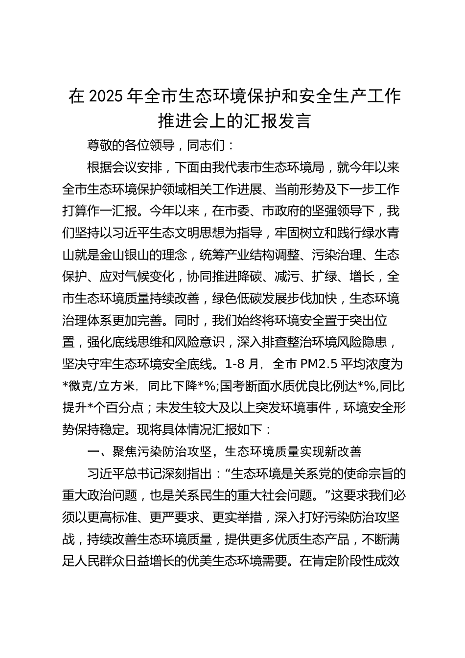 在2025年全市生態(tài)環(huán)境保護(hù)和安全生產(chǎn)工作推進(jìn)會(huì)上的匯報(bào)發(fā)言